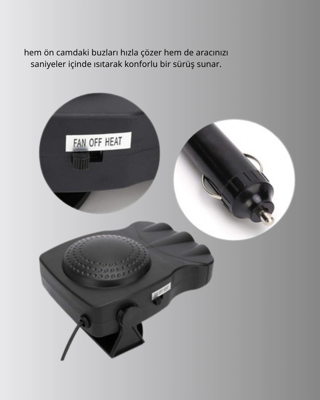 Kışın soğuktan, yazın bunaltıcı sıcaktan kurtulmak artık çok kolay! 150W Araç İçi Isıtıcı ve Fan Kompakt Tasarım ve Hızlı Isıtma Özellikli, yıl boyunca aracınızda konforu garanti eder.Gelişmiş 3’ü 1 arada sistemi, ısıtıcı, fan ve buz çözücü özelliklerini bir araya getirir. Bu sayede kışın camlardaki buğuyu hızla temizlerken yazın serin bir hava akışı sağlar.12V çakmak girişiyle çalışan cihaz, her araçla uyumludur.1,2 metre uzunluğundaki güç kablosu, esnek bir kullanım alanı yaratır.360° dönebilen başlık, havayı istediğiniz yöne yönlendirmenizi sağlar — ön cam, sürücü bölgesi veya yolcu tarafı fark etmeden tüm alanlarda etkili bir performans sunar.Sağlam ABS plastik gövdesi, yüksek sıcaklıklara karşı dayanıklıdır.Küçük ama güçlü tasarımıyla aracınızda yer kaplamaz ve kolay taşınır.Hem güvenli hem de sessiz çalışan bu ısıtıcı, donmuş camları çözme ve kabin içi ısı dengeleme konusunda en pratik çözümlerden biridir.Kışın sıcak, yazın serin sürüş keyfini bu çok yönlü cihazla yaşayın!