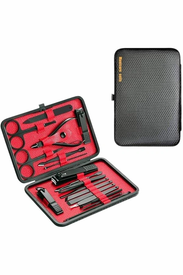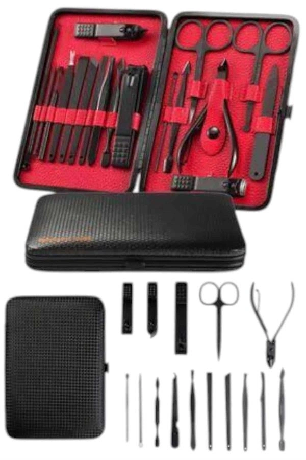 Özel tasarımıyla dikkat çeken bu 17 parçalık manikür seti, el ve ayak bakımınızı profesyonelce yapmanız için tüm gerekli malzemeleri bir araya getiriyor. Paslanmaz çelikten üretilmiş dayanıklı ve uzun ömürlü parçaları sayesinde güvenli sterilizasyon sağlar, kolay temizlenir ve korozyonu önleyerek hijyenik bir kullanım sunar. Yeni nesil siyah kaymaz parlatma teknolojisi ile üretilmiş keskin ve ergonomik tasarımı, kullanım kolaylığı ve estetik görünümü bir araya getirir.Şık ve sağlam deri kaplama kutusu sayesinde düzenli bir şekilde saklanabilir ve tek düğmeyle kolayca açılıp kapanabilir. Hafif ve taşınabilir yapısıyla çantanızda rahatça taşıyabilir, günlük kullanım veya seyahatlerinizde yanınızda bulundurabilirsiniz. Setin içeriğinde büyük, küçük ve sivri uçlu tırnak makasları, çift uçlu komedon, törpü, et ittirici, çift taraflı tırnak kaldırma aleti, makas, pedikür bıçakları, V şeklinde et itme aparatı, tırnak temizleme çubuğu, cımbız, iğneli komedon ve kulak temizleme aparatı bulunmaktadır.Her detayı düşünülerek tasarlanmış bu manikür seti, hem kendi bakımınızı pratik şekilde yapmanızı sağlar hem de sevdiklerinize hediye edebileceğiniz şık ve kullanışlı bir alternatif sunar.