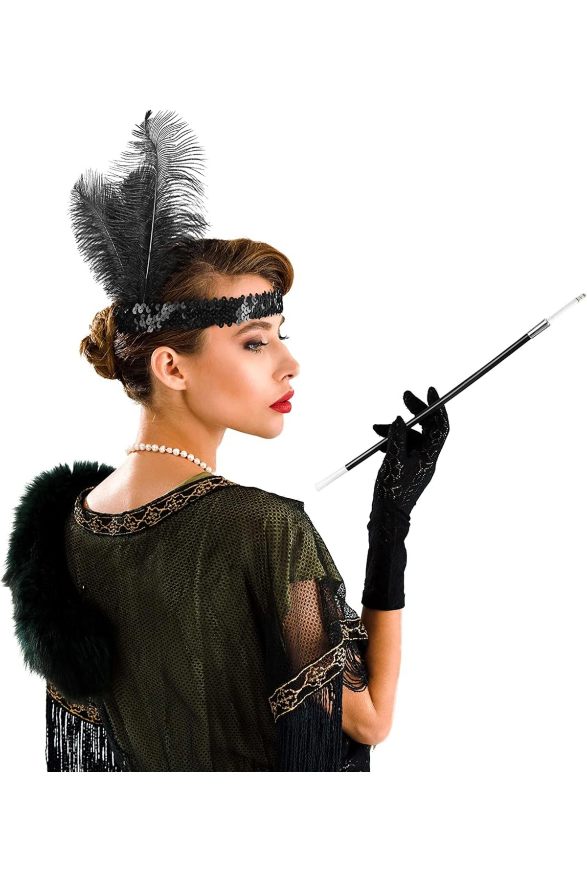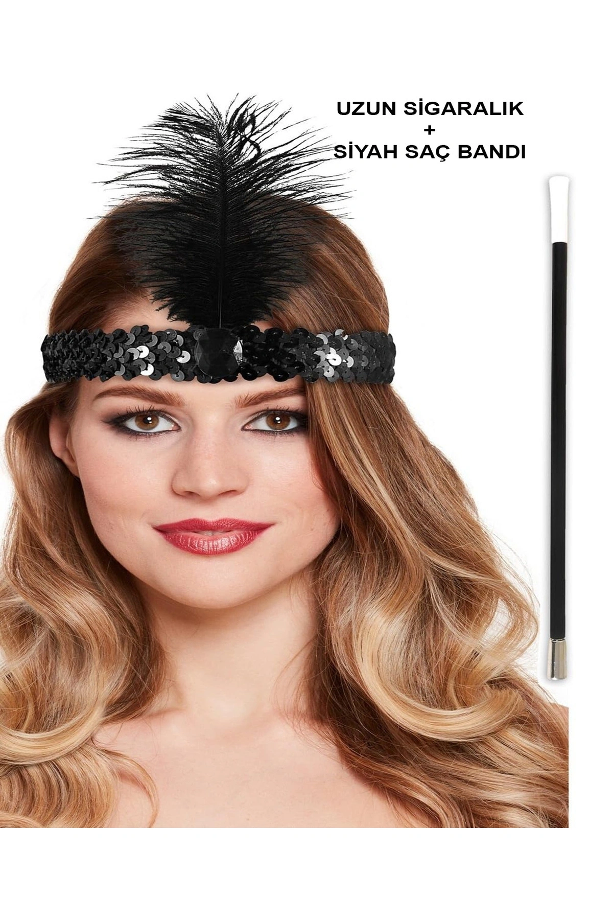 1920'ler Gatsby Aksesuar Seti - Siyah Charleston Saç Bandı & Sigaralık 1920’lerin büyüleyici dünyasını yansıtan bu zarif aksesuar seti, şıklığı ve cazibeyi bir arada sunuyor.; The Great Gatsby’nin ihtişamlı atmosferinden ilham alınarak tasarlanan bu set, flapper stilini yansıtan detaylarla her ortamda dikkatleri üzerine çekiyor.; Siyah Charleston Saç Bandı: Bu zarif saç bandı, 1920’lerin flapper tarzını mükemmel bir şekilde tamamlar.; Siyah rengiyle her türlü gece elbisesiyle uyum sağlar, üzerindeki ışıltılı taşlar ve zarif tüy detaylarıyla göz alıcı bir görünüm sunar.; Göz alıcı bir şekilde takarak, Gatsby'nin dünyasında kendinizi bir yıldız gibi hissedebilirsiniz.; Sigaralık: 1920’lerin sinema ve sosyal yaşamının simgelerinden biri olan sigaralık, elinizde taşıyacağınız en sofistike aksesuarınız olacak.; Uzun, ince bir tutuşa sahip sigaralık, modern zamanların zarif bir yansımasıdır ve sizi Gatsby'nin büyülü dünyasına taşır.; Bu aksesuar seti, 1920’ler Gatsby temalı bir parti, düğün ya da özel bir gece için mükemmel bir tercihtir.; Zengin detayları, şıklığı ve nostaljik havasıyla, adeta bir dönemin kapılarını aralar.; Eğer siz de o dönemin etkileyici havasını üzerinde taşımak istiyorsanız, bu set tam size göre!