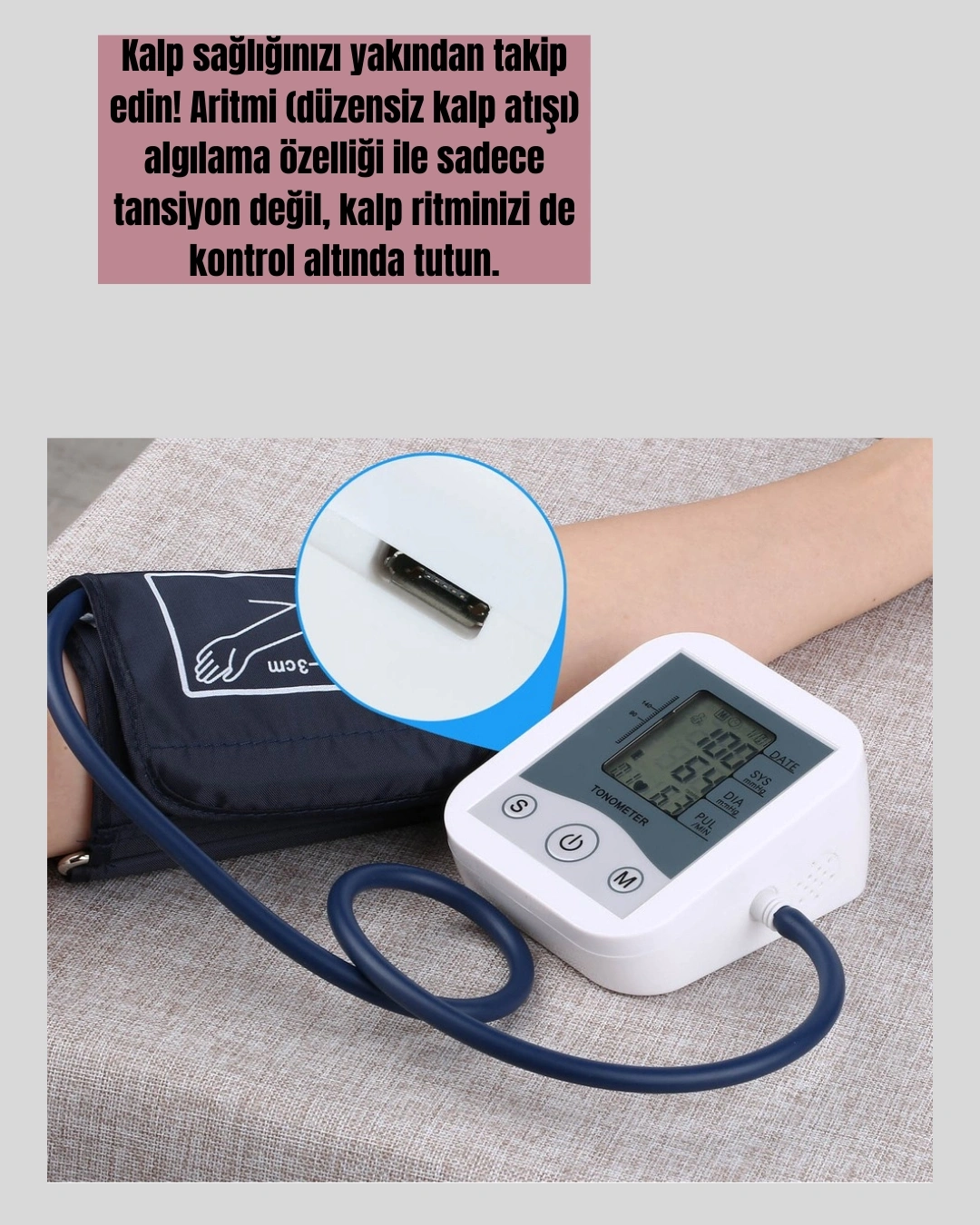Taşınabilir elektronik tansiyon ölçer, ergonomik tasarımı ve çift güç kaynağı desteği ile her yerde kullanıma uygun pratik bir cihazdır. 4 adet AAA pil ile çalışabileceği gibi Android uyumlu USB kablosu ile de enerji sağlayabilirsiniz. Bu sayede cihazınızı istediğiniz ortamda rahatlıkla kullanabilirsiniz.LCD dijital ekranı sayesinde ölçüm sonuçlarını büyük ve net şekilde görüntüleyebilirsiniz. IHB aritmi tespit özelliği ile yalnızca tansiyonunuzu ölçmekle kalmaz, kalp ritminizdeki olası düzensizlikleri de algılayarak daha güvenli bir kullanım sunar. 2 kullanıcı için ayrı ayrı 99 ölçüm hafızası sayesinde aile bireyleri sonuçlarını kolayca takip edebilir.20mmHg - 280mmHg arasında ölçüm aralığı sunan cihaz ±3mmHg hata payı ile son derece hassas sonuçlar verir. Nabız hızı ölçüm kapasitesi 40-200 atım/dakika aralığındadır. 300 gramlık hafif yapısı sayesinde yanınızda rahatça taşıyabilirsiniz. Paket içerisinde tansiyon ölçüm bandajı, kullanım kılavuzu ve monitör yer almaktadır. Evde sağlık takibini kolaylaştıran bu cihaz, pratikliği ve güvenilirliği ile günlük kullanım için idealdir.