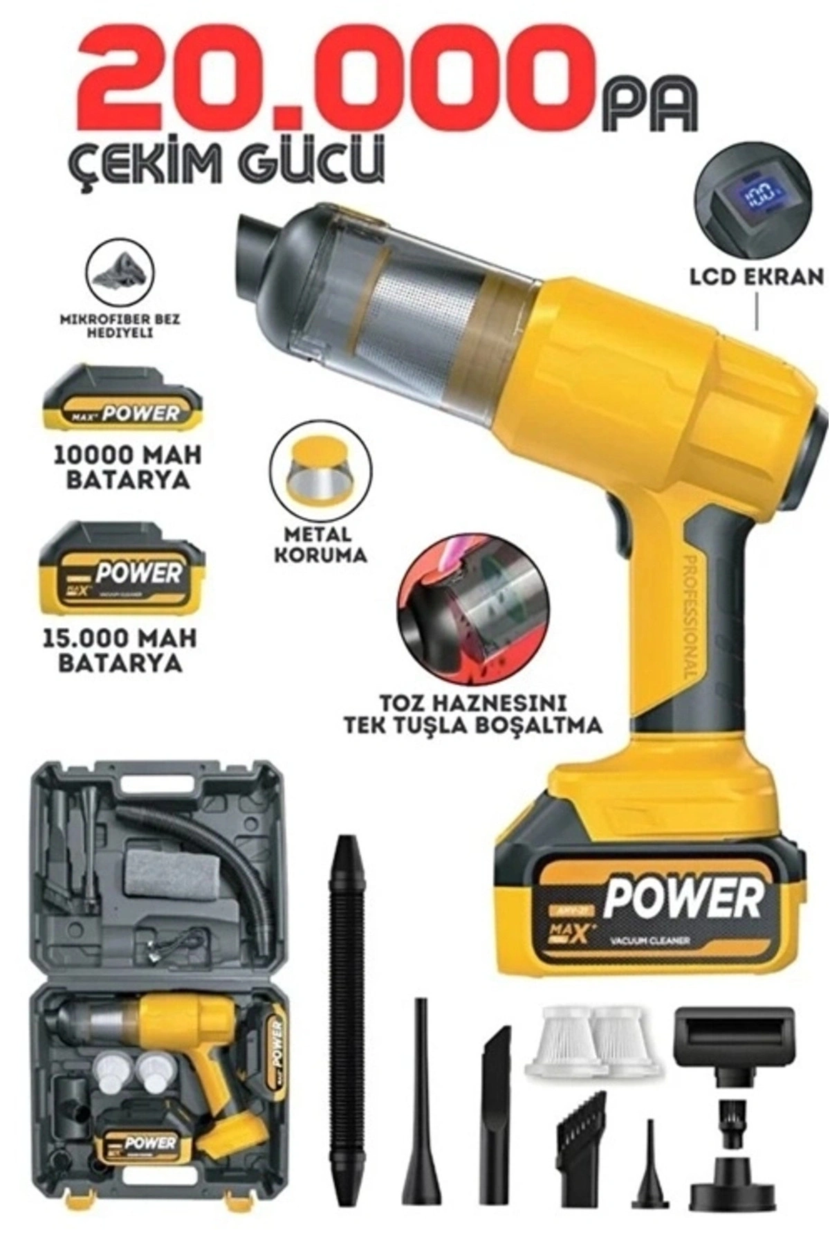 Batarya: 10.000+15.000mAhGüç: 20000Pa55Brushlesh Motor90.000 RPMGösterge: Lcd EkranPaket içeriği: Süpürge, 2 batarya , Yedek Filtre, 8 aparat, Çanta, Kılavuz, MİKROFİBER BEZ HEDİYE.; Güçlü 20.000PA Emiş Güc:Yüksek performanslı fırçasız motorla donatılan süpürgemiz, koltuklardan, halılardan ve köşelerden tozu, evcil hayvan tüylerini ve inatçı kalıntıları kolayca temizlemek için 20.000PA'lık güçlü emiş gücü sunararacınızı minimum çabayla lekesiz tutar25.000mAh Yüksek Kapasiteli Uzun Çalışma Süresi:Tüm aracınızı tek seferde temizleyin.; İki yüksek kapasiteli şarj edilebilir pil, kesintisiz çalışma sağlayarak kesinti süresini azaltır ve verimliliği artırır.; Yıkanabilir Filtre ve Çoklu Başlık Tasarımıyla Bakımı Kolay:İki yeniden kullanılabilir HEPA filtre ve birden fazla çıkarılabilir başlık ile birlikte gelir.; Çeşitli görevler için çift filtreleme etkisi sunar.; Tüm aksesuarlar, sorunsuz kurulum ve saklama için kolayca takılır.2'si 1 Arada Süpürge ve Üfleme Fonksiyonu:Sadece bir elektrikli süpürge değilklavyelerdeki, havalandırma deliklerindeki tozu temizlemek veya küçük eşyaları şişirmek için üfleme moduna geçin.; Çoklu görevler ve daha temiz bir yaşam tarzı için idealdir.; Her Yerde Kolay Kullanım için Kablosuz ve Hafif: Sadece 1,1 kg ağırlığındaki bu kompakt elektrikli süpürge, kablosuz ve ultra taşınabilirdir.; Arabanızda, evinizde veya ofisinizde dar alanları temizlemek için mükemmeldirkablo karmaşası yok, sınırlama yok.; NOT: DİKKAT: ÜRÜN TESTİ, TEMİZ BİR YÜZEYDE YAPILMASI GEREKMEKTEDİR, BU TÜR ÜRÜNLER DE YALNIZCA MUTAT KULLANIM VE OLAĞAN GÖZDEN GEÇİRMENİN ÖLÇÜSÜNDE TEST YAPILABİLİR, KULLANILMIŞ, DEFORMASYONA UĞRAMIŞ, KİRLİ, EKSİK, KORUNAKSIZ GÖNDERİM SEBEBİYLE DEFORMASYON, OLMAMALI İÇERİSİNİN TEMİZ OLMASI GEREKİR, AKSİ DURUMDA KABUL EDİLMEYECEKTİR