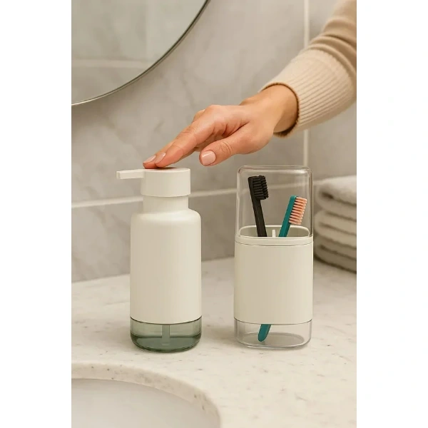 2'Lİ SIVI SABUNLUK VE DİŞ FIRÇALIK SETİÜrün Özellikleri2’li sıvı sabunluk ve diş fırçalık seti, banyonuzda düzen ve şıklığı bir arada sunar. Modern tasarımıyla banyolara estetik bir dokunuş katar. Sabunluk kısmı sıvı sabun, şampuan veya losyon için kullanılabilirken, diş fırçalık bölümü fırçalarınızı hijyenik şekilde muhafaza etmenizi sağlar. Sağlam ve kaliteli malzemeden üretilmiş olup uzun süreli kullanım için uygundur. Pratik yapısı sayesinde temizlik ve kullanım kolaylığı sağlar.Paket İçeriği1 adet sıvı sabunluk1 adet diş fırçalık