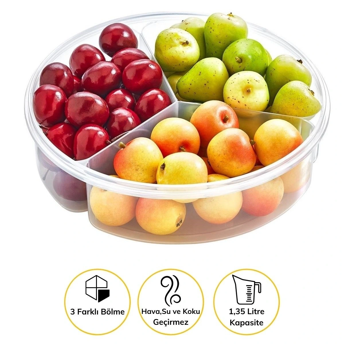 3 Bölmeli Kilitli Kapaklı 1,35 Litre Yuvarlak Erzak Saklama Kabı Diyet Saklama Kabı Taşınabilir Beslenme Kabı