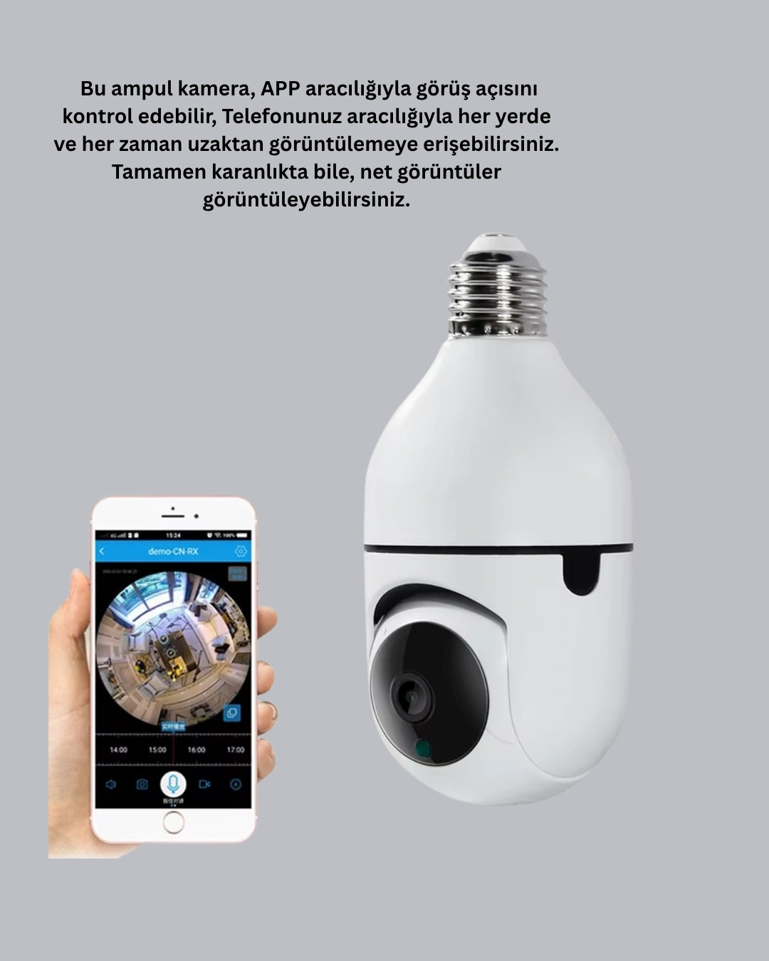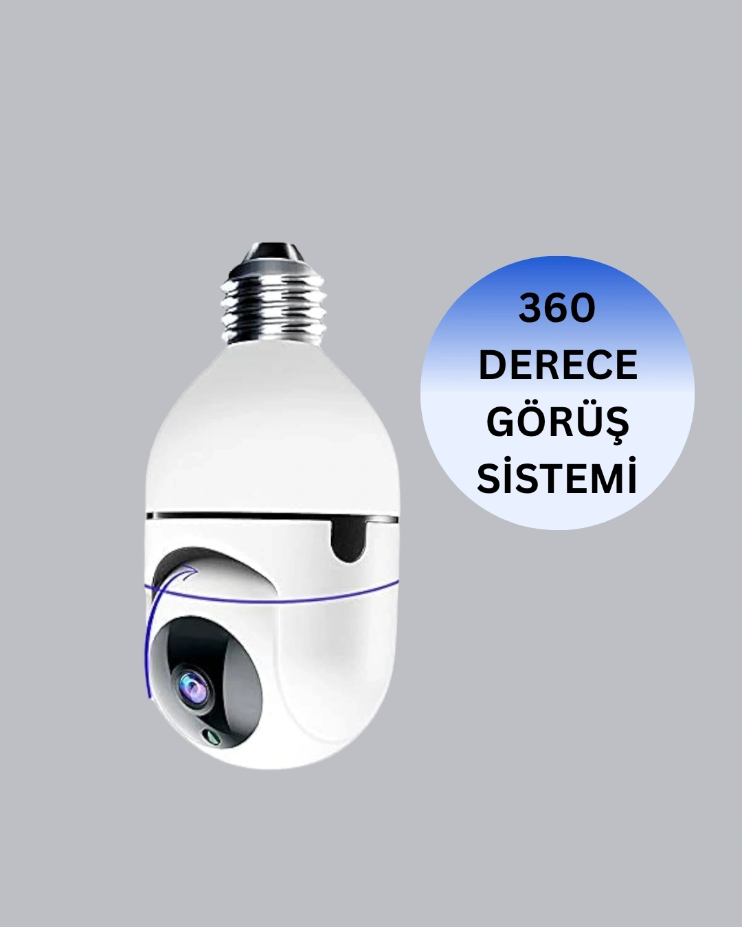 Ampul tipi bu kamera, bulunduğu ortamı 360 derece izleyerek maksimum görüntü kapsama alanı sunar. Panoramik kayıt özelliği sayesinde sabit bir noktadan tüm alanı görebilir. Görüntü kalitesi, 1080P HD seviyesinde olup ayrıntıların net şekilde görüntülenmesini sağlar.E27 ampul yuvasına monte edilerek kısa sürede kurulabilir. Pratik montaj süreci ve sade tasarımı sayesinde görünmeden izleme imkânı sağlar.Cihazda bulunan gece görüş özelliği ile ışığın olmadığı ortamlarda bile net görüntüler kaydedilir. Gece ile gündüz arasında kalite farkı en aza indirilmiştir.Hareket algılama fonksiyonu sayesinde ortamda herhangi bir hareket algılandığında otomatik olarak kayıt başlar ve kullanıcıya bildirim gönderilir.İki yönlü ses desteği sayesinde karşılıklı konuşma yapılabilir veya ortam dinlenebilir. Bu özellik özellikle giriş çıkışları kontrol etmek isteyen kullanıcılar için avantaj sağlar.