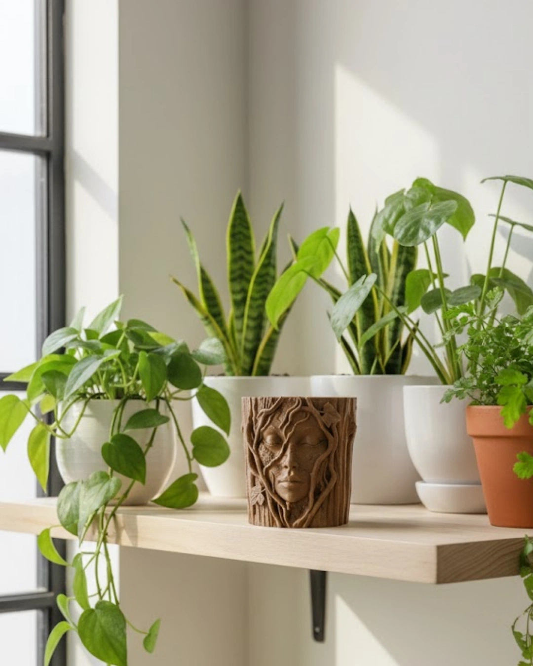 Doğanın zarafetini heykelsi bir formda sunan bu özel tasarım saksı, dekorasyonunuza karakter kazandırmak için tasarlanmıştır. Ağaç dokusu üzerine işlenmiş sakin yüz ifadesi, huzur ve dinginliği simgeler. Sarmaşıkların yüzü sarmalayan detaylı yapısı ürüne masalsı bir hava katmaktadır. Toprak tonlarının sıcaklığı mekâna doğal bir ambiyans sunarken, üç boyutlu kabartmalar premium bir görünüm sağlar. Minimal alanlarda bile güçlü bir dekoratif etki yaratır. Hem ev hem ofis ortamında dikkat çekici bir aksesuar olarak öne çıkar.