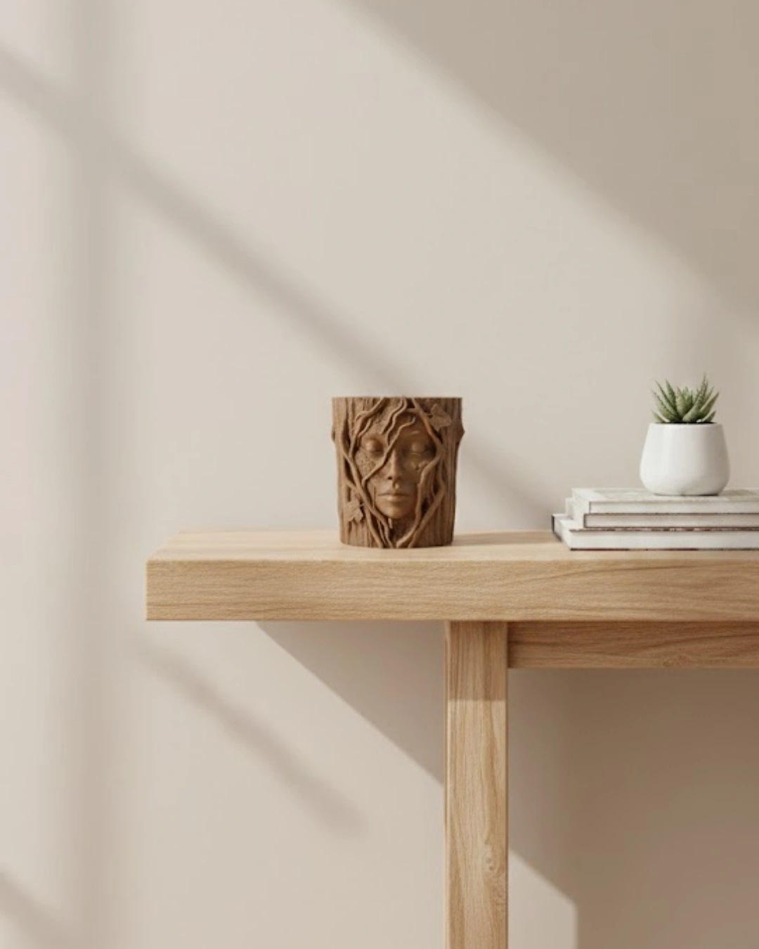 3D Doğal Ahşap Görünümlü Yüz Detaylı Dekoratif Vazo Sanat Tasarım