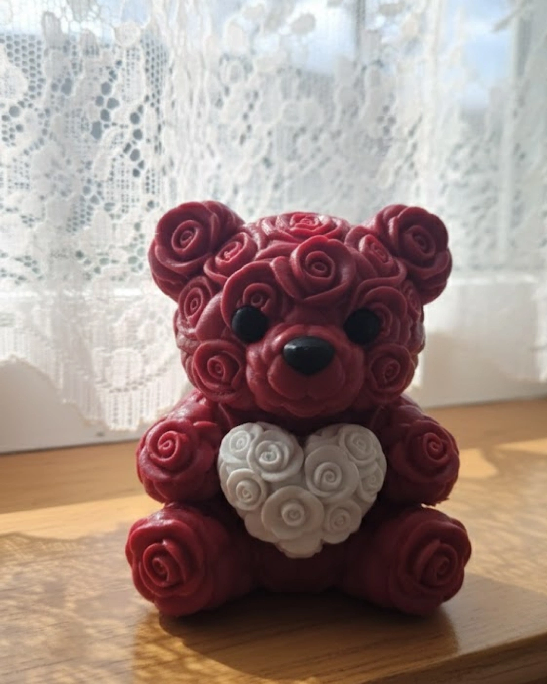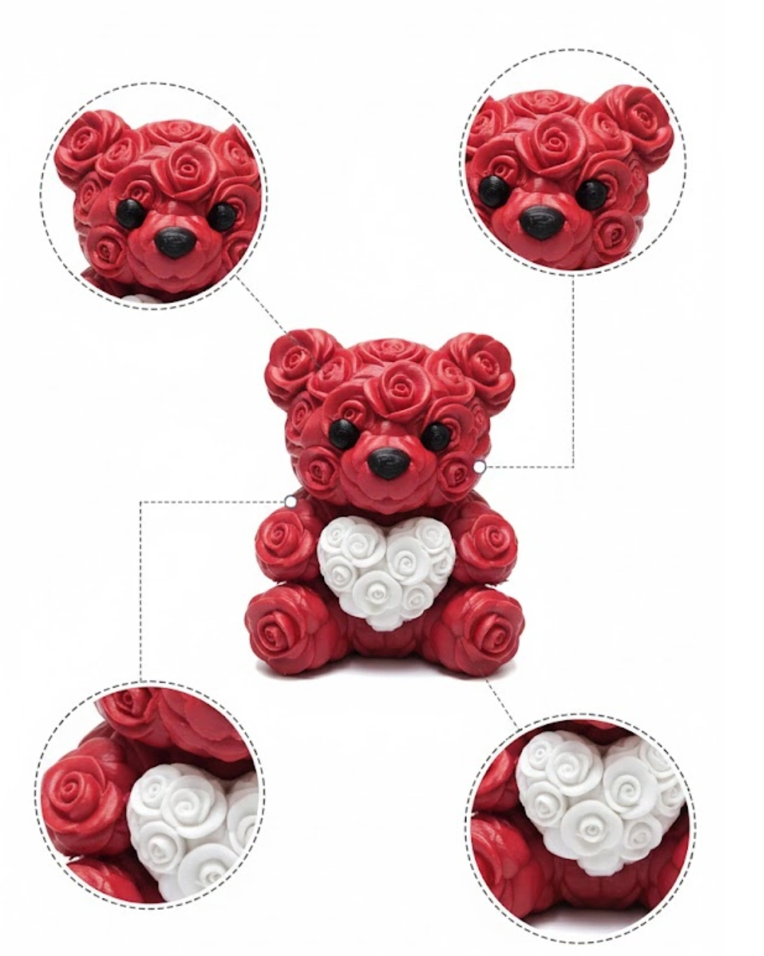10 cm boyutundaki bu kalp ayıcık, 3D baskı teknolojisi ile üretilmiş şık bir dekoratif objedir. Gül kabartmaları ürüne zengin bir görünüm kazandırır. Göğsünde taşıdığı kalp figürü ile sevgi temasını güçlü şekilde yansıtır. Küçük ama etkileyici tasarımı sayesinde bulunduğu ortamda dikkat çeker. Hediye alternatifi olarak da oldukça anlamlıdır. Dayanıklı yapısı sayesinde uzun süre formunu korur.
