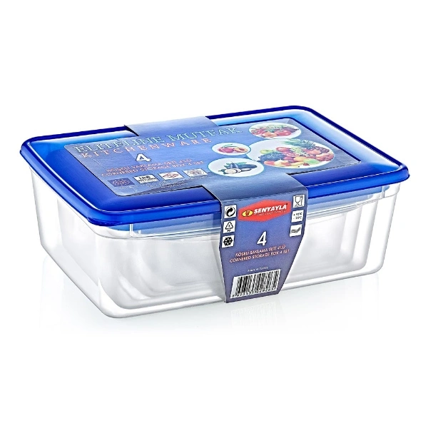 4'LÜ KÖŞELİ SAKLAMA KABI SETİÜrün ÖzellikleriMutfakta düzen ve hijyeni ön planda tutmak isteyenler için tasarlanan 4'lü Köşeli Saklama Kabı Seti, farklı hacimlere sahip dört ayrı kap ile geniş bir saklama kabı seti çözümü sunar. Set içerisinde 20x13,5x7 cm, 24x16,5x8,5 cm, 27,5x19,5x9,5 cm ve 30,5x22x10,5 cm ölçülerinde toplam dört adet kap yer alır. Şeffaf gövde tasarımı sayesinde içerisindeki gıdaları kolayca görmenizi sağlayan köşeli saklama kabı formu, dolap ve buzdolabında düzenli bir yerleşim imkânı sunar. Sızdırmaz mavi kapakları, gıdaların tazeliğini korumaya yardımcı olur ve hem buzdolabında hem de mutfak dolaplarında güvenle kullanılabilir. Dayanıklı ve BPA içermeyen plastik malzemeden üretilmiş olup gıda ile temasa uygundur. İç içe geçebilen yapısı sayesinde yer tasarrufu sağlar ve yemek, salata, kahvaltılık, meyve veya kuru gıdalar için hijyenik bir mutfak saklama çözümü sunar. Piknik, seyahat ve ofis kullanımı için de pratik bir alternatiftir.Ürün Teknik Özellikleri Özellik Açıklama Ürün Adı 4'lü Köşeli Saklama Kabı Seti Adet 4 Parça Set Ölçüler 20x13,5x7 cm / 24x16,5x8,5 cm / 27,5x19,5x9,5 cm / 30,5x22x10,5 cm Malzeme BPA içermeyen plastik Kullanım Alanı Buzdolabı ve mutfak dolabı kullanımı Paket İçeriği4 adet farklı boyutta köşeli saklama kabı