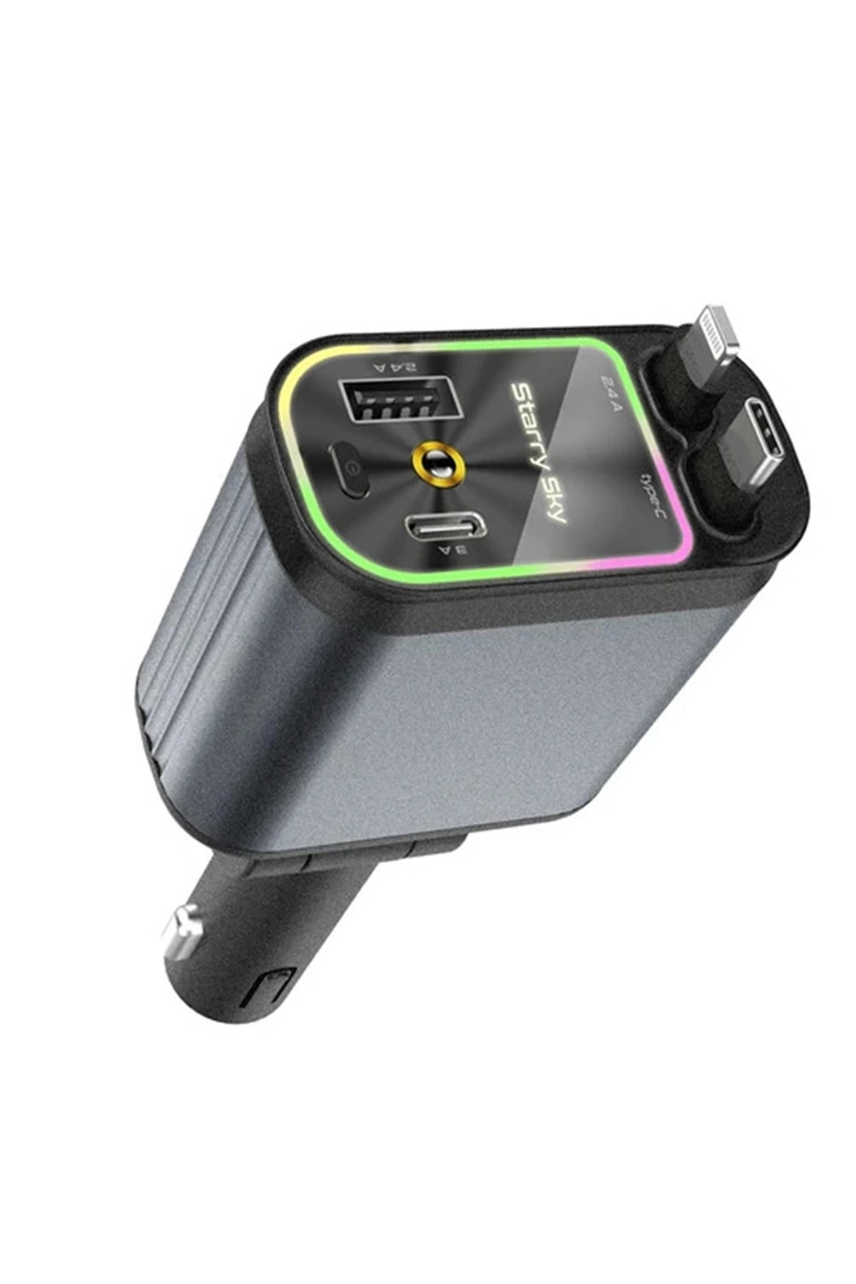 4'ü 1 arada Çift USB Bağlantı Çakmaklık, Type-C Hızlı Şarjlı 66W,Geri Çekilebilir Araç Telefon Şarj CihazıGeliştirilmiş Araç Şarj Cihazı :Yıldızlı Gökyüzüne Sahip Araç Şarj Cihazı.; 4'ü 1 arada araç şarj cihazı, gerçek bir PD 66W Type-C geri çekilebilir kablo (hızlı şarj portu), bir IOS geri çekilebilir kablo ve ek USB-C ve USB-A portları ile donatılmıştır, bu şarj cihazı aynı anda dört cihaza kadar hızlı şarj imkanı sunar.; Kullanışlı Geri Çekilebilir Tasarım :Geri çekilebilir araç şarj cihazıyla aracınızın iç mekanını düzenleyin.; İki 80 cm uzunluğunda uzatılabilir kabloya sahip olan bu şarj cihazı, basit depolama çözümleri sunar ve aracınızı düzenli ve organize tutar.; Ayarlanabilir 180 derece Şarj Fişi :Geri çekilebilir şarj fişi 180 derece sola ve sağa ayarlanabiliyor, bu sayede engebeli yollarda bile güvenli ve istikrarlı şarj sağlıyor ve uzun yolculuklar için güvenilir bir araç şarj cihazı USB-C seçeneği haline geliyor.; Geniş Uyumluluk :12V DC'den 24V DC'ye kadar uyumlulukla, bu 4'ü 1 arada geri çekilebilir araç telefonu şarj cihazı çeşitli cihazlarla çalışır.; İster telefonunuz, tabletiniz, dizüstü bilgisayarınız veya anahtarınız olsun, araç telefonu şarj cihazı sizi korur.; Güvenli ve Emniyetli Kullanım :Cihazınızın güvenliğini sabit bir fişle önceliklendirin, aşırı şarj, aşırı sıcaklık ve kısa devrelere karşı koruma sağlayın ve koruyucu devreler.; iPhone ve Android ile uyumlu olan araç şarj cihazı hızlı ve verimli şarj sağlar.