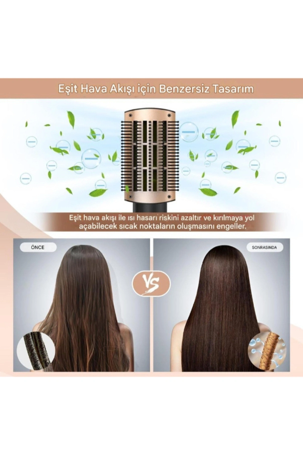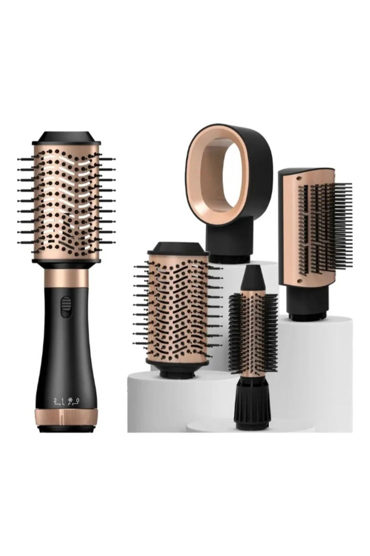 5 BAŞLIKLI AIR SAÇ ŞEKİLLENDİRİCİ SET Ürün ÖzellikleriHyundai HC-092, profesyonel düzeyde performans sunan 5 başlıklı çok işlevli saç şekillendirme setidir. Saç kurutma makinesi, hava şekillendirici, fön fırçası ve maşa özelliklerini tek bir cihazda birleştirir. 1000W gücüyle hızlı ısınır, güçlü hava akışı sayesinde saçlarınızı kısa sürede kuruturken aynı anda şekillendirir.Setin içerisinde yer alan 5 farklı başlık, tüm saç tiplerine ve stillerine uygun kullanım sağlar:Fön başlığı: Saçı kurutur ve şekle hazır hale getirir.Büyük yuvarlak fırça: Hacim kazandırır ve dalga oluşturur.Küçük yuvarlak fırça: İnce saçlar için ideal bukle ve kıvrımlar sağlar.Düzleştirici fırça: Pürüzsüz ve düz bir görünüm kazandırır.Halka kurutucu başlık: Hava akışını yönlendirerek ısıyı eşit dağıtır.Üç farklı sıcaklık kademesi sayesinde ısıyı saç tipinize göre ayarlayabilir, soğuk hava modu ile şekli uzun süre koruyabilirsiniz. İyonik teknolojisiyle saçın elektriklenmesini azaltır, parlaklık ve yumuşaklık sağlar. Hafif gövdesi ve ergonomik tasarımıyla uzun süreli kullanımlarda bile konfor sunar.Paket İçeriği1 adet Hyundai HC-092 saç şekillendirici gövde5 adet değiştirilebilir başlık1 adet kullanım kılavuzu