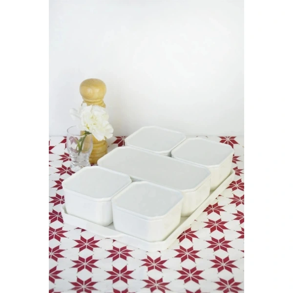 6'LI KAHVALTILIK SETİÜrün Özellikleri6'lı Kahvaltılık Seti, kahvaltı sofralarınızı düzenli ve şık hale getiren zarif bir sunum çözümüdür. Yüksek kaliteli porselenden üretilmiş bu set, farklı yiyecekleri ayrı bölmelerde saklamanızı sağlar. 5 adet kahvaltılık kabı ve bir adet tepsisi bulunur. Kapaklı tasarımı sayesinde kahvaltılıklarınızı uzun süre taze tutar. Geniş servis tepsisi ile kolay taşınabilir ve mutfakta düzen sağlar. Hem günlük kullanım hem de misafir ağırlamak için ideal bir üründür.Paket İçeriği1 Adet 6'lı Kahvaltılık Seti