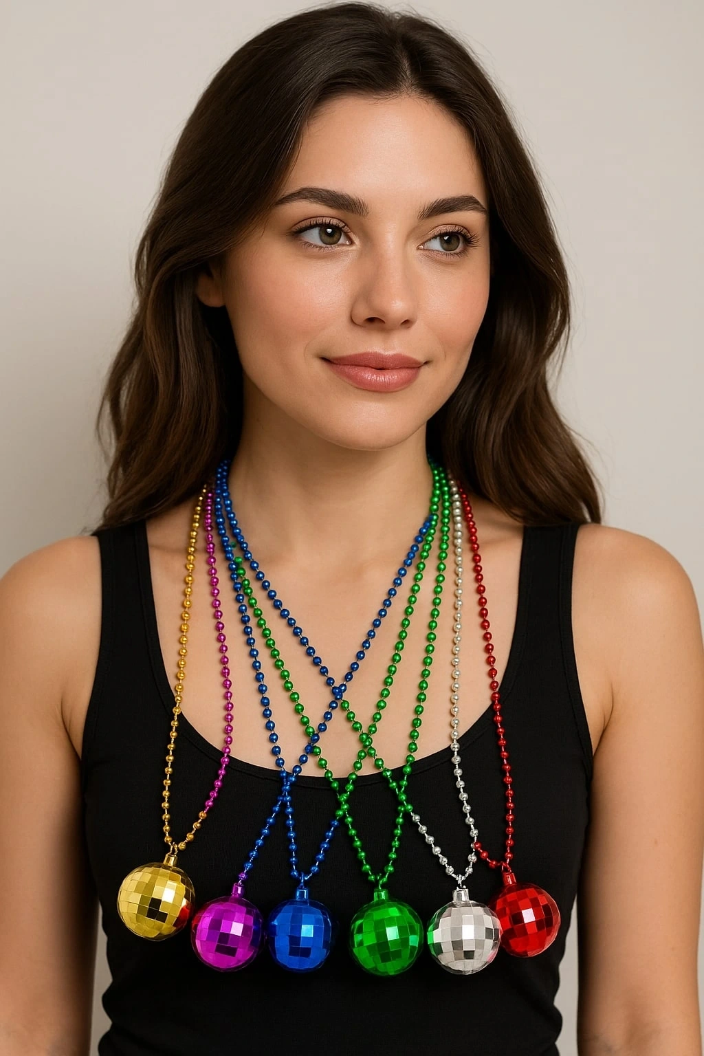70'lerin disko ruhunu, 80'lerin neon çılgınlığını ve 90'ların pop star havasını bir araya getiren bu eşsiz disko topu kolye setiyle zamanda yolculuğa çıkın! Her döneme ait ikonik renkler ve tasarımlarla hazırlanan bu set, partilerinize nostaljik bir dokunuş katacak.