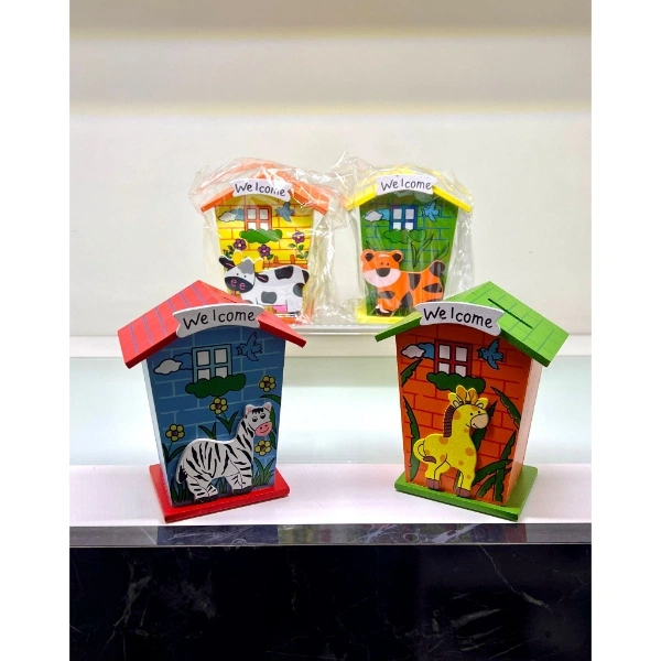 AHŞAP EV TASARIMLI KUMBARAÜrün ÖzellikleriÇocuklar için tasarlanmış hem dekoratif hem de fonksiyonel bir Ahşap Ev Tasarımlı Kumbara modelidir. Ahşap malzemeden üretilmiş olup dayanıklı bir yapıya sahiptir. Üzerinde yer alan renkli hayvan figürleri ve "Welcome" yazısı, çocukların ilgisini çekerken odalarına eğlenceli bir hava katar.Alt kısmında bulunan kapak sayesinde birikimler kolayca alınabilir ve yeniden kullanılabilir. Farklı renk ve desen seçenekleri ile her zevke hitap eder.Hem para biriktirme alışkanlığı kazandırmak hem de odada dekoratif bir obje olarak kullanılmak için ideal bir üründür. Hafif ve taşınabilir olması sayesinde istenilen her yerde rahatlıkla kullanılabilir.Eğitim materyali, hediye veya dekoratif amaçlarla tercih edilebilir.Çocukların finansal farkındalık geliştirmesine yardımcı olurken, odalarına şık bir görünüm kazandırır.Paket İçeriği1  adet Ahşap Ev Tasarımlı Kumbara