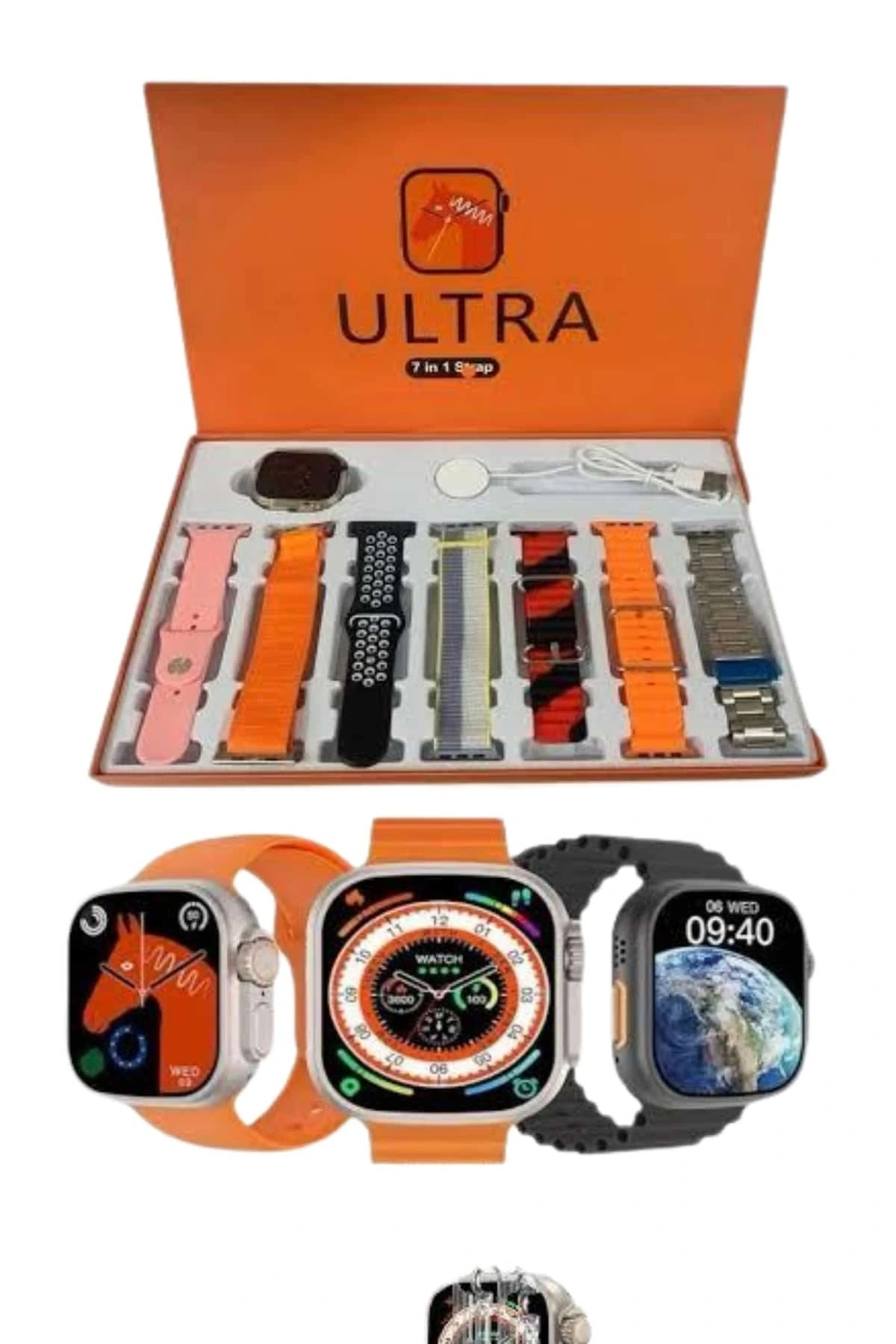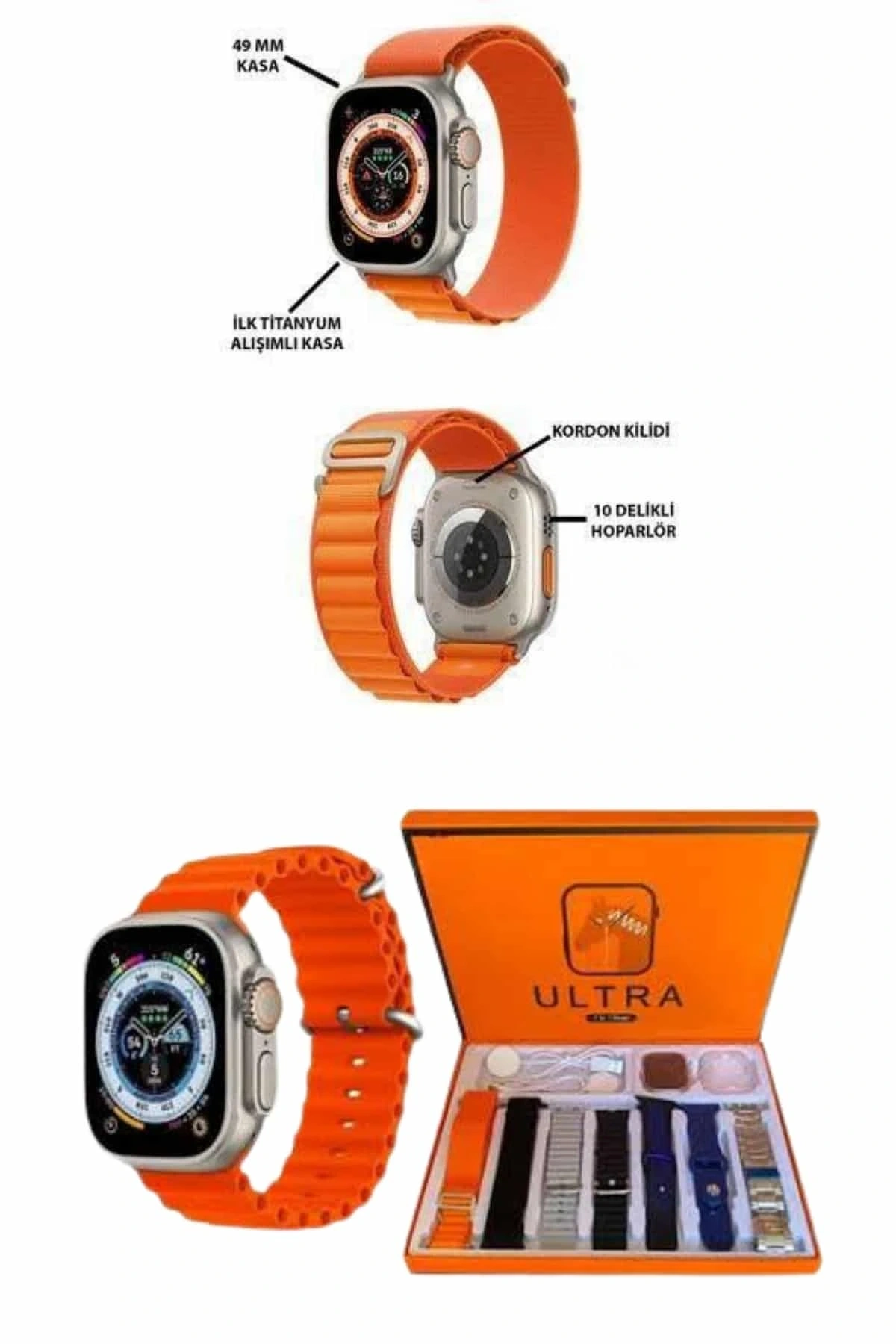 8 Ultra 7-in-1 Akıllı Saat: Bir saatin sunabileceği tüm fonksiyonları bir araya getiren bu şık akıllı saat, günlük hayatınızı kolaylaştıran birçok özellik sunuyor. 7 kordonlu tasarımıyla hem estetik hem de fonksiyonel bir tasarım sunarken, modern hayatın ihtiyaçlarına tamamen uyum sağlar.Sesli Çağrı Yanıtlama ve Konuşma: Sesli çağrıları yanıtlayabilir, mesajlarınızı ve bildirimlerinizi anlık olarak takip edebilirsiniz. Çift hoparlörü ve yüksek kaliteli mikrofonu sayesinde, sesli aramalarda net ve kaliteli bir ses deneyimi sunar. Ayrıca, bu modeldeki ilk çift hoparlör teknolojisi, ses performansını bir üst seviyeye taşır.