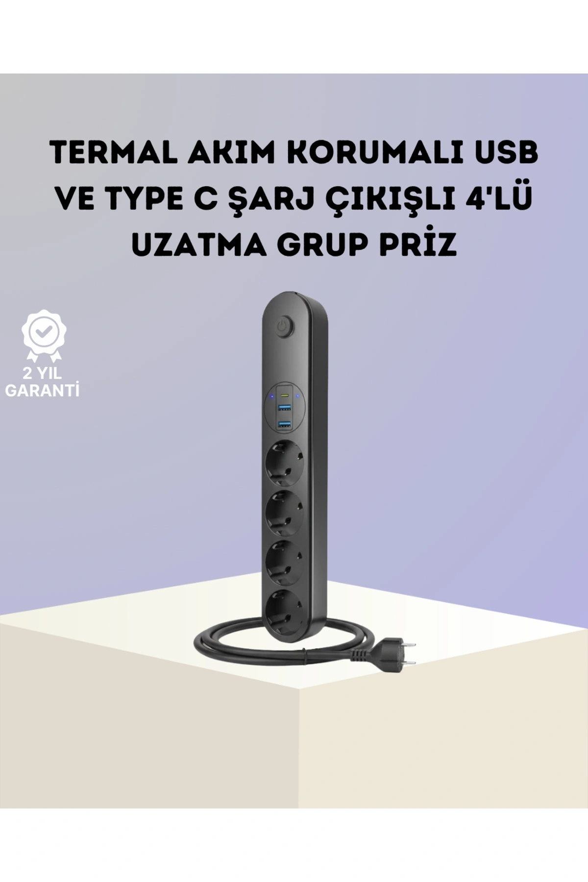 4 prizli akım korumalı çoklu priz, modern yaşamın artan enerji ve bağlantı ihtiyaçlarına pratik bir çözüm sunar.; 2 USB ve 1 Type-C çıkışı sayesinde telefon, tablet ve diğer taşınabilir cihazlarınızı ek adaptöre gerek kalmadan şarj edebilirsiniz.; 2500 Joule maksimum koruma kapasitesi ile cihazlarınızı ani voltaj dalgalanmalarına karşı güvence altına alır.; Akıllı akım dengeleme teknolojisi, bağlı cihazları otomatik algılayarak ideal enerji dağılımı yapar.; Bu özellik hem şarj verimliliğini artırır hem de cihaz bataryalarının korunmasına katkı sağlar.; Termal akım koruma sistemi, aşırı ısınma ve kısa devre durumlarında devreyi otomatik olarak keserek güvenli kullanım sunar.; Yüksek kalite PC-ABC gövde malzemesi, ısıya ve darbelere karşı dayanıklıdır.; 20.000 kez tak-çıkar ömrüne sahip priz yuvaları, uzun yıllar güvenle kullanılabilir.; Led göstergeli açma kapama anahtarı, 10.000 kez kullanıma dayanıklı yapısıyla dikkat çeker.; 2 metrelik kablosu, esnek kullanım alanı sunar ve masa altı, TV ünitesi veya ofis ortamlarında rahat yerleşim sağlar.; Siyah renkli sade tasarımı, hem ev hem profesyonel alanlarda estetik bir görünüm oluşturur.; Bilgisayarlar, kameralar, televizyonlar, yazıcılar ve diğer elektronik cihazlarla uyumlu olan bu çoklu priz, güvenlik ve fonksiyonelliği bir arada arayan kullanıcılar için ideal bir tercihtir.
