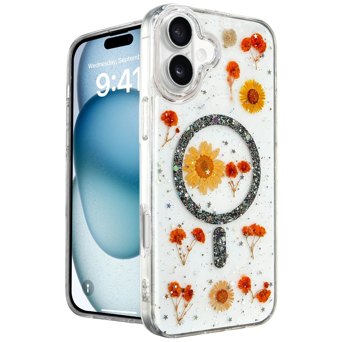 Daisy Simli MagSafe Kapak, doğanın zarafetini ve sadeliğini yansıtan, içinde gerçek çiçeklerin bulunduğu eşsiz bir tasarıma sahiptir. Kapak, içindeki gerçek papatya çiçekleri ve simli arka planı ile cihazınıza doğal bir güzellik katarken, her kapak kendi içinde benzersizdir. Bu, telefonunuzu hem korurken hem de ona kişisel bir dokunuş ekler.