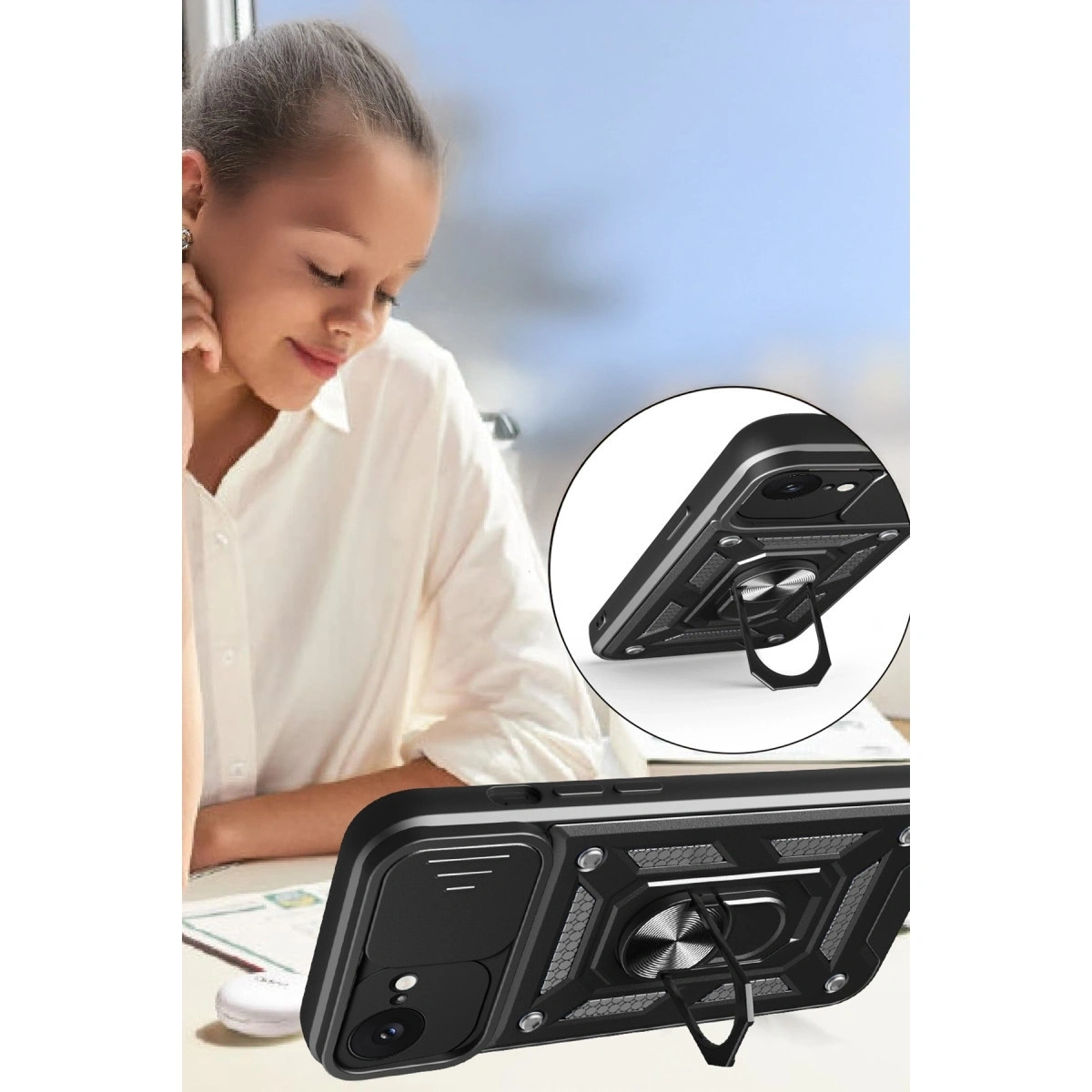 Kılıfın arka kısmında yer alan entegre metal halka hem tutucu hem de stand olarak işlev görür. Eller serbest video izleme, içerik görüntüleme ya da masaüstü kullanımı için idealdir.
