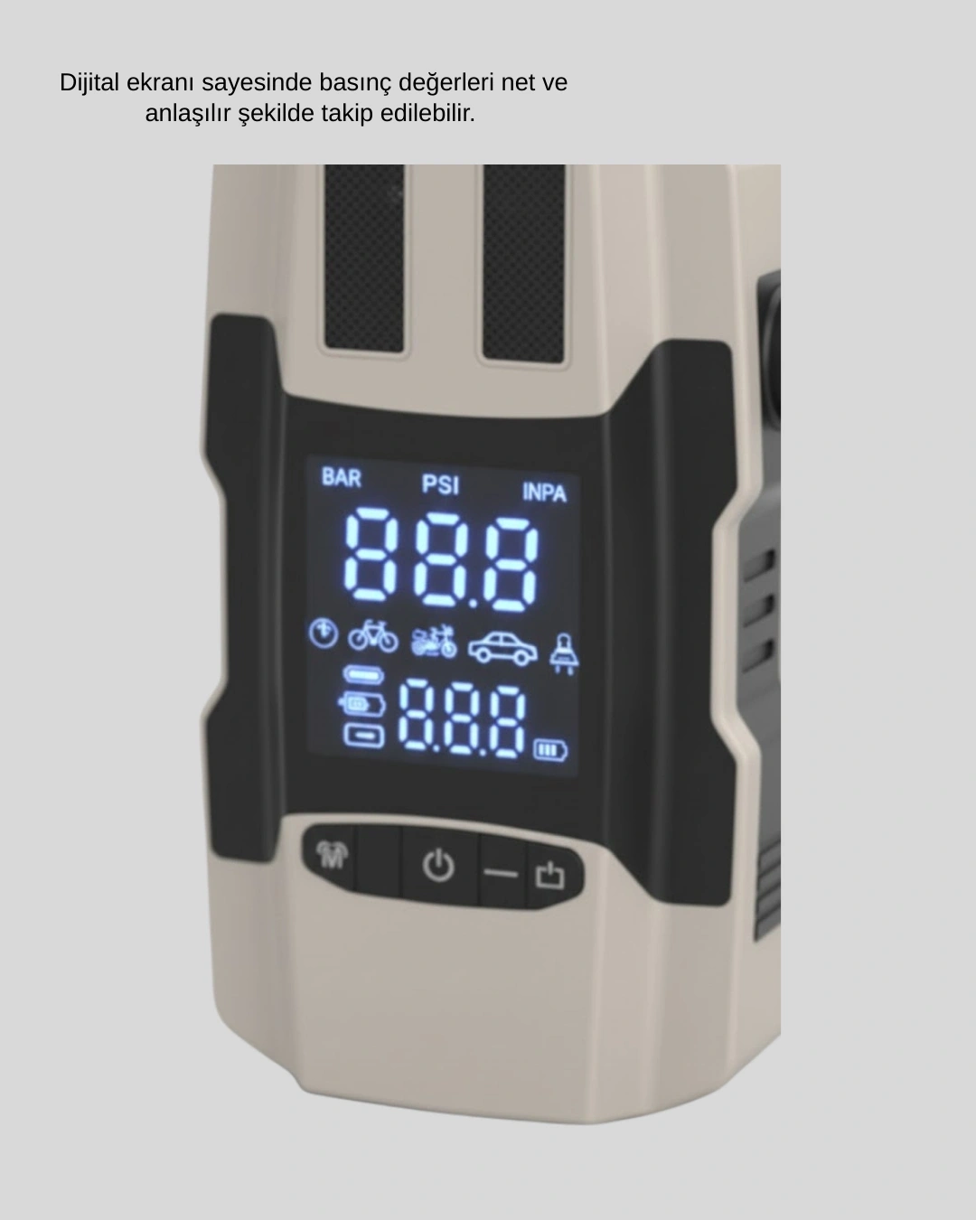 Bu çok fonksiyonlu araç cihazı, lastik şişirme pompası, akü takviye ünitesi ve powerbank özelliklerini tek gövdede bir araya getirir. 12.000 mAh kapasiteli bataryası sayesinde acil durumlarda araç aküsünü takviye edebilir ve mobil cihazlarınızı şarj edebilirsiniz. Dahili hava pompası, araç lastiklerini pratik ve hızlı şekilde şişirmeye yardımcı olur. Dijital ekranı sayesinde basınç değerleri net ve anlaşılır şekilde takip edilebilir. Araçta güvenle taşınabilecek kompakt bir çözümdür.