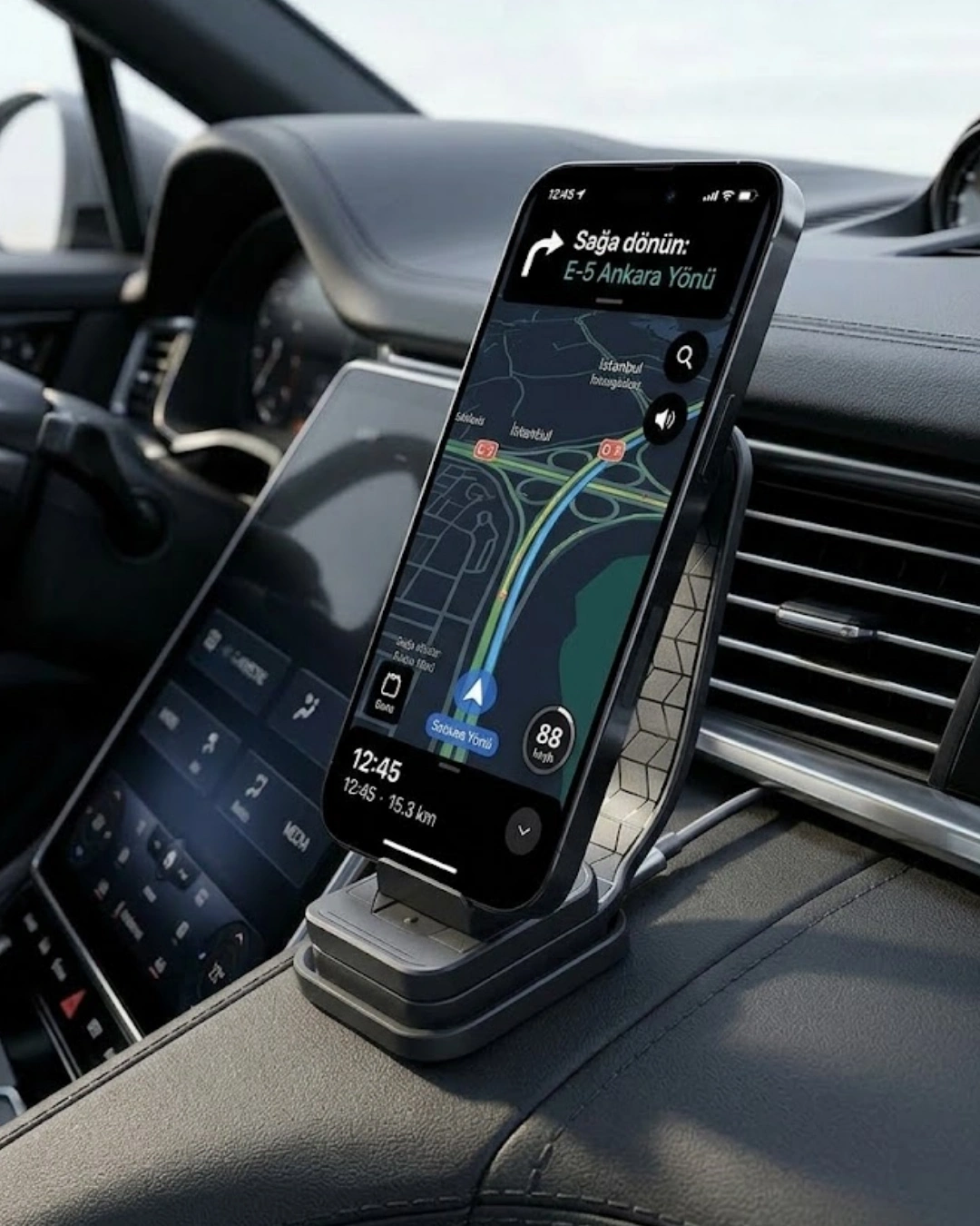 Araç telefon tutucu, telefonunuzu araç içinde sabitleyerek sürüş sırasında daha güvenli kullanım sağlayan kullanışlı bir üründür. Manyetik tasarımı sayesinde telefonunuzu hızlı ve kolay şekilde yerleştirebilirsiniz. 360 derece dönebilen başlık mekanizması sayesinde telefonunuzu istediğiniz açıya ayarlayabilirsiniz. Bu özellik navigasyon kullanımını daha rahat hale getirir. Katlanabilir tasarımı sayesinde ürün farklı açılarda kullanılabilir ve gerektiğinde kompakt hale getirilebilir. Modern ve sade tasarımı sayesinde araç içi kullanım için ideal bir çözümdür.