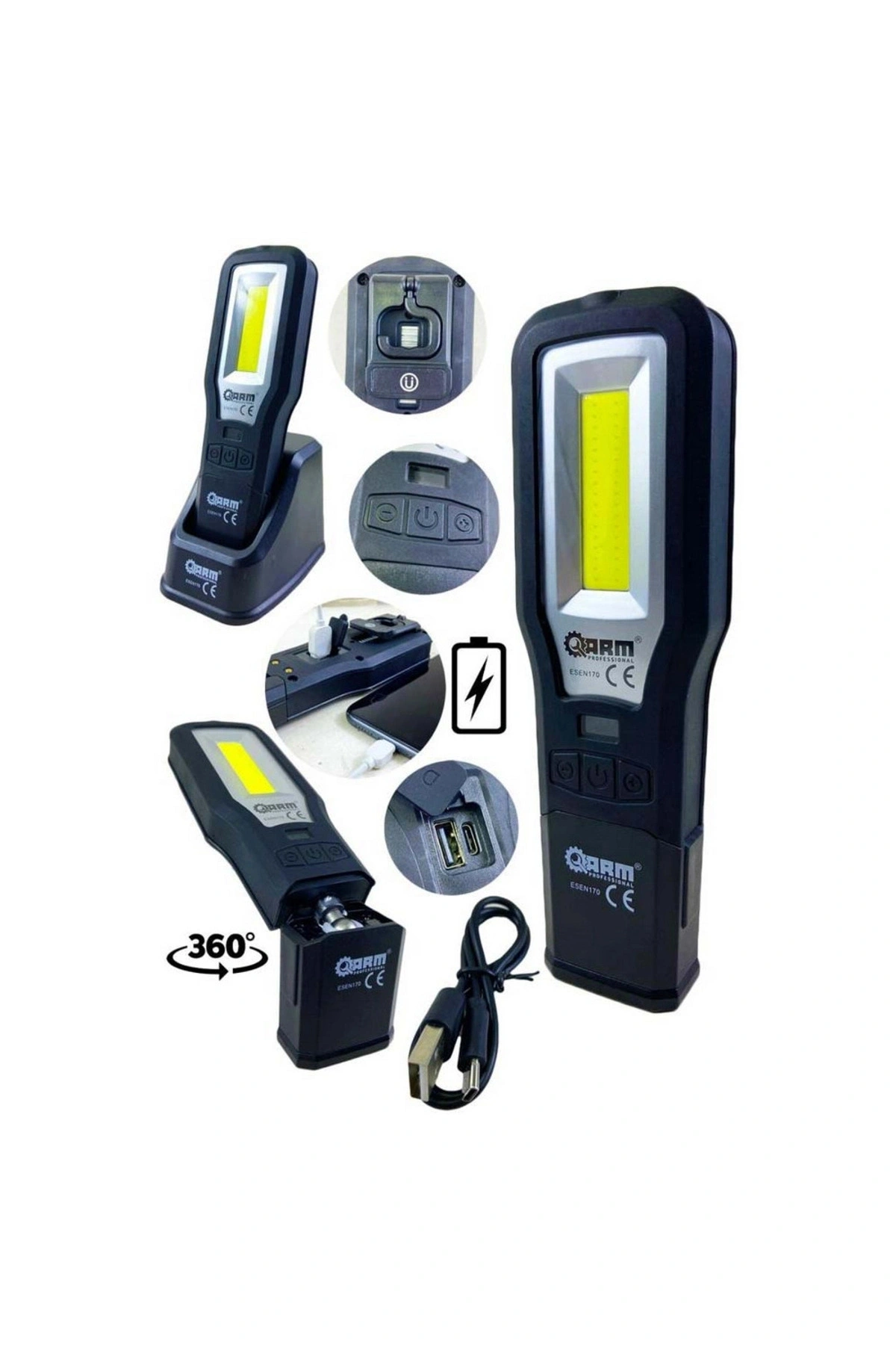 Arm ESEN170 550 Lümen Ultraviyoleli Özellikli Miknatıslı Şarjlı Tamirci FeneriÖzelliklerGüçlü Mıknatıs (1 kemer kısmında 1 alt tarafta)Micro USB şarj girişi (Paket içeriğinde 1 Micro USB kablo bulunmaktadır)USB şarj çıkışı (içerisindeki 4400 mAh batarya sayesinde telefonunuzu tabletiniz vs şarj edebilirsiniz)180 Derece Dönebilen AyakIşık Gücü yükseltme düşürme ayarıKemer klipsi360 derece dönen asma kancasıŞarj göstergesi15 Metreye Kadar Aydınlatma GücüUV ışık özelliğiyle mor tespit cihazı olarak ta kullanılabilir.; Özel şarj standı ile kablosuz şarj imkanıTeknik ÖzelliklerMaterial: TPR+ABS+ PC Lamba Tipi: LEDÜst lamba: 150 Lümen 3WattOrta lamba: 350 Lümen 5 WattBatarya Tip 18650