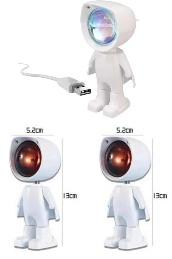 Gün batımı efektli bu şarjlı lamba, sevimli astronot tasarımı ile dikkat çeken hem işlevsel hem de dekoratif bir aydınlatma çözümüdür. LED ışık kaynağı sayesinde loş, yumuşak ve sıcak bir aydınlatma sunar; böylece ortamda huzurlu ve sakin bir atmosfer yaratır. Özellikle yatak odası, oturma odası ya da çalışma alanları gibi kişisel yaşam alanlarında hem gece lambası hem de ortam ışığı olarak rahatlıkla kullanılabilir.360 derece dönebilen başlığı ve 60 derece yukarı-aşağı hareket kabiliyeti sayesinde ışığın açısını kolaylıkla ayarlayabilir, istediğiniz duvar ya da alana doğrudan yansıtabilirsiniz. Bu sayede yalnızca ortama ışık vermekle kalmaz, aynı zamanda dekoratif bir efekt yaratır. Kompakt ve taşınabilir yapısıyla ev dışında da rahatlıkla kullanılabilir; ister seyahatlerde ister dış mekân etkinliklerinde şarjlı yapısıyla kablosuz olarak yanınızda taşıyabilirsiniz.USB kablosu ile kolayca şarj edilen bu ürün, tam dolumda yaklaşık 3-4 saat kesintisiz kullanım sunar. Güç kaynağına bağlıyken ise sınırsız kullanım avantajı sağlar. Dokunmatik kontrol paneli ile ışığı açıp kapamak ve parlaklık seviyesini ayarlamak son derece pratiktir. Bu özellik, hem kullanım kolaylığı hem de modern bir deneyim sunar.Gün batımı projektör lambası, yalnızca fonksiyonel bir gece lambası değil, aynı zamanda romantik ve sıcak bir ambiyans yaratmak isteyenler için eşsiz bir aksesuardır. Film izlerken, kitap okurken ya da sadece dinlenmek istediğinizde ortamı yumuşak ışığıyla dönüştürür. Ayrıca fotoğraf ve video çekimlerinde estetik bir arka plan ışığı olarak da kullanılabilir. Şıklığı ve işlevselliği bir arada sunan bu ürün, hem kendiniz için hem de sevdiklerinize hediye olarak ideal bir tercihtir.