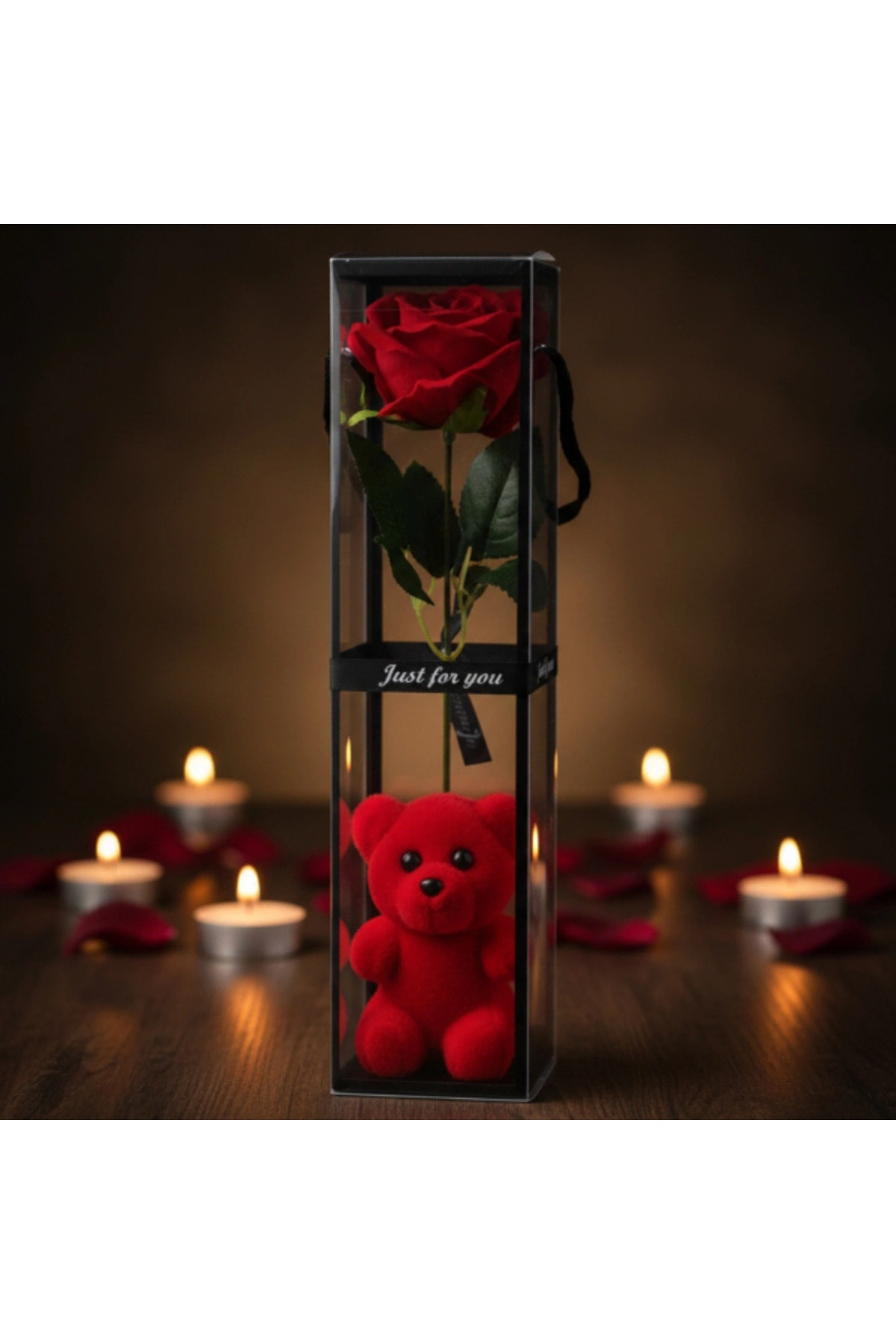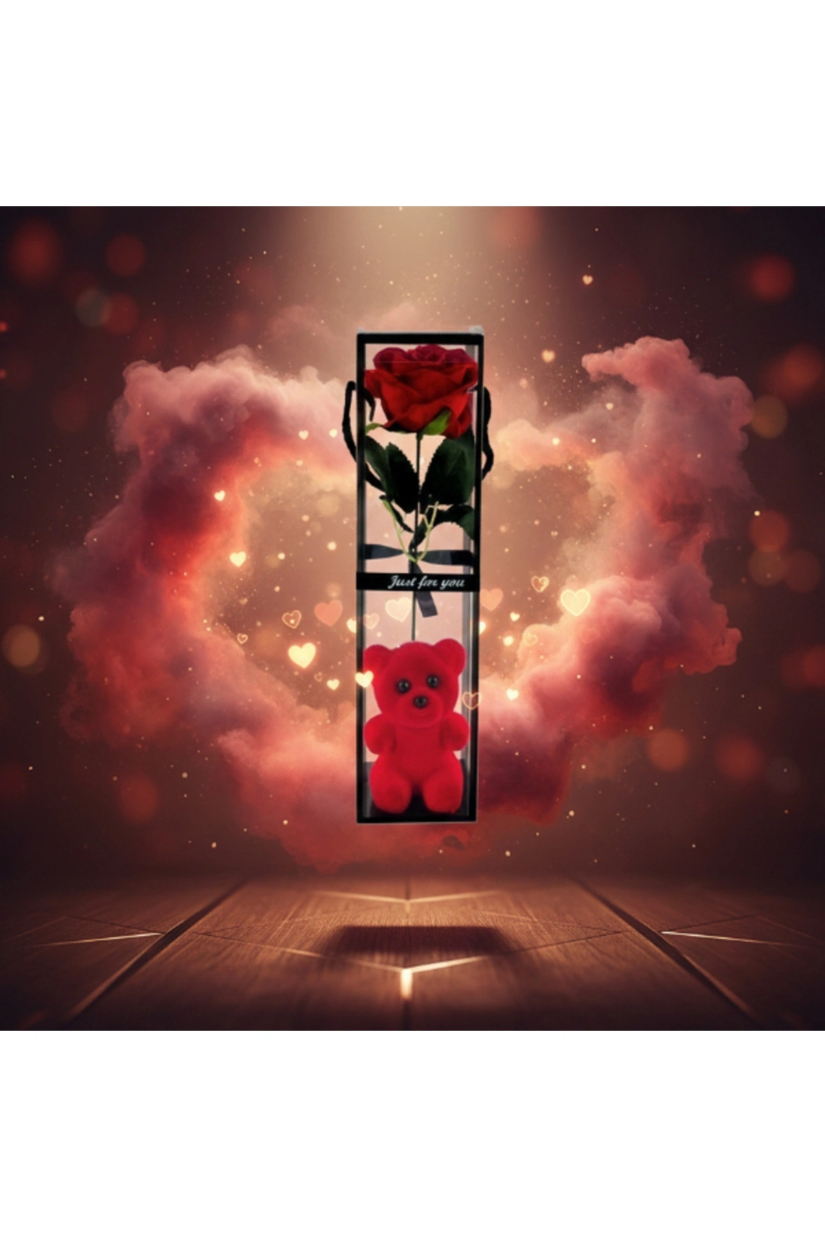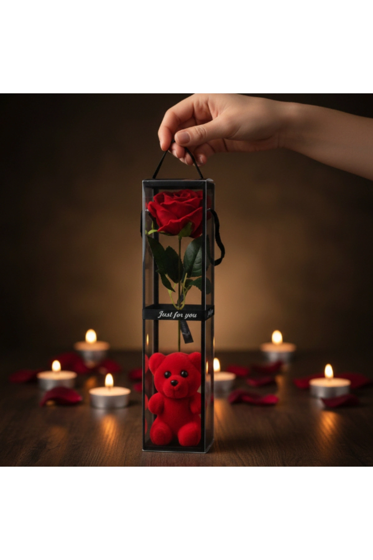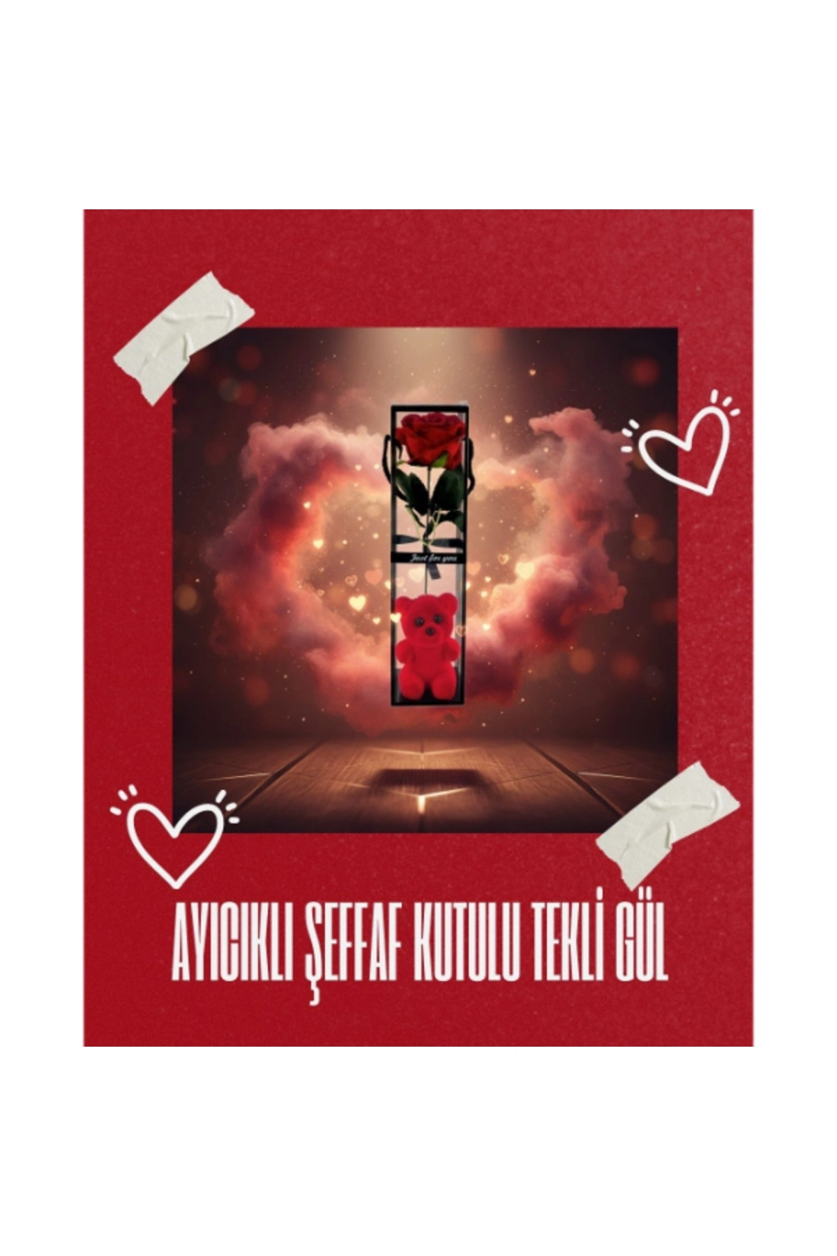 AYICIKLI ŞEFFAF KUTULU TEKLİ GÜLÜrün ÖzellikleriAyıcıklı şeffaf kutulu tekli gül, zarif sunumu ve sevimli detaylarıyla özel günlerde duyguları en şık şekilde ifade etmeye yardımcı olan dekoratif ve hediyelik bir üründür. Şeffaf kutu tasarımı, içerisindeki tekli yapay gülü ve alt bölümde yer alan ayıcık figürünü estetik biçimde sergileyerek modern ve dikkat çekici bir görünüm sunar. Kompakt ve dikey formu sayesinde masa, raf ve vitrin üzerinde kolaylıkla konumlandırılabilir. Minimal tasarımıyla her dekorasyon stiline uyum sağlayan bu model, sevgililer günü, doğum günü ve yıl dönümü gibi özel anlarda şık hediyelik gül arayanlar için ideal bir tercihtir. Kutulu yapısı sayesinde hediye sunumunu pratik ve etkileyici hale getirir.Ürün Teknik Özellikleri Özellik Açıklama Ürün Adı Ayıcıklı Şeffaf Kutulu Tekli Gül Tasarım Şeffaf kutu, tekli gül ve ayıcık figürü Gül Türü Yapay dekoratif gül Kullanım Alanı Masa, raf, vitrin Kullanım Amacı Dekoratif ve hediyelik Paket İçeriği1 adet ayıcıklı şeffaf kutulu tekli gül