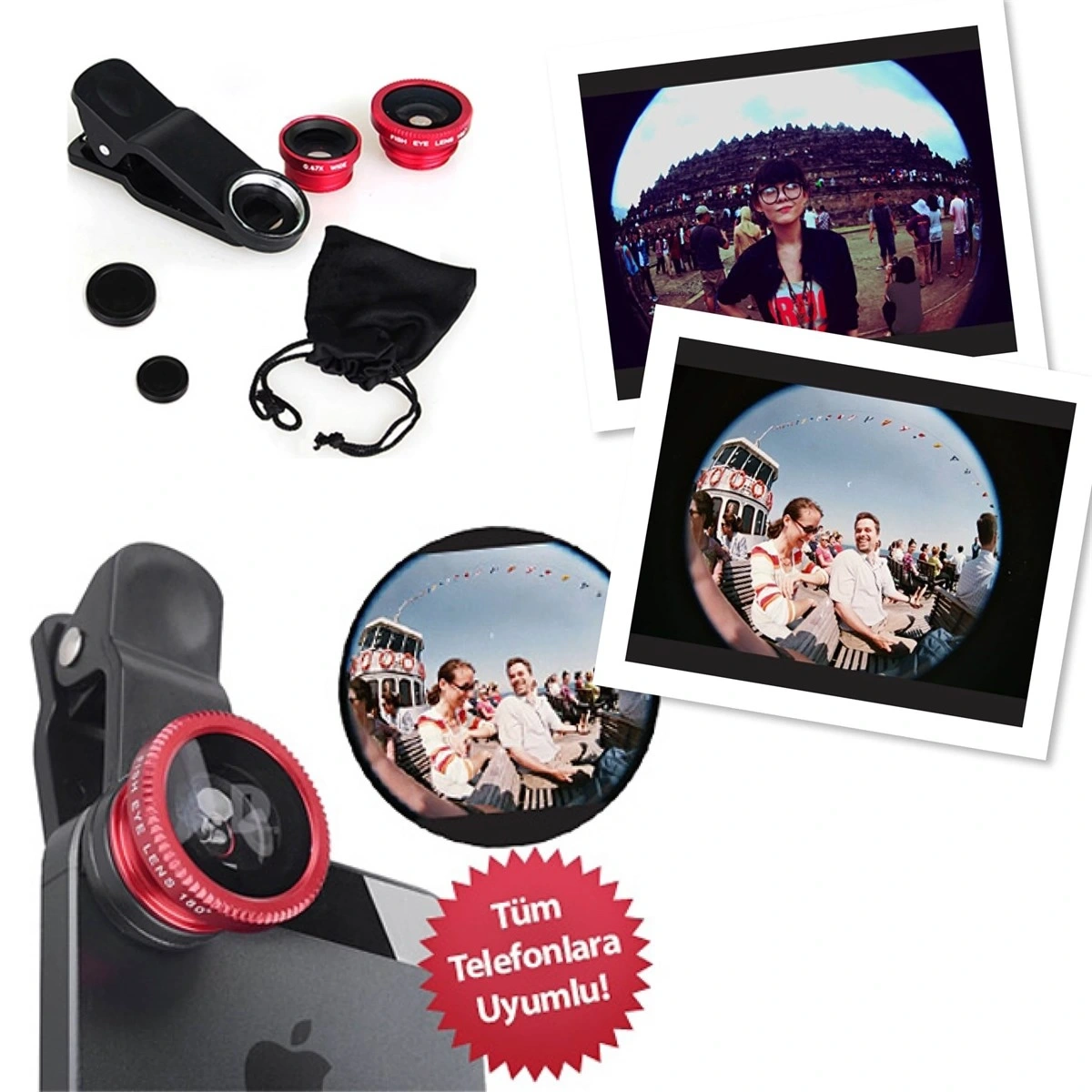 Son dönemde birçok sosyal paylaşım sitesinde arkadaşlarınızın paylaştığı fish eye görüş açısıyla çekilmiş fotoğrafları fark etmişsinizdir. Peki ama nasıl bu görüş açısını yakalıyorlar? Tabi ki Universal Geniş Açılı Lens Fish Eye ile! Tüm akıllı telefonlar ile uyumlu lensler sayesinde, ister seyahat ettiğiniz yerlerde isterseniz de arkadaş grubunuz ile harika kareler yakalamak artık mümkün. Paket içeriğindeki 3 adet lens ile farklı görüntüler yakalayabilir ve bu görüntüleri arkadaşlarınızla paylaşabilirsiniz. Son derece kolay kullanıma sahip lensleri paket içeriğine dahil lens mandalı ile tüm akıllı telefonlarda kullanabilirsiniz. Kullanım Talimatı: Lens mandalını telefonunuzun kamerasına denk gelecek şekilde yerleştirin. Kullanmak istediğiniz lensi lens mandalına çevirerek takın. Ürün Özellikleri: 2 adet farklı lens (fish eye- macro wide) Lens mandalı ile akıllı telefonlara uyumlu Kolay kullanım ve taşınabilme özelliği Paket İçeriği:   1 Adet Wide Lens 1 Adet Fish Eye Lens 1 Adet Micro Lens 1 Adet Lens Mandalı 1 Adet Lens Kılıfı   Not: Ürün Karışık Renklerde Gönderilecektir. Micro ve Wide Lensler birbirine monte haldedir.Wide lens Micro lens ile beraber kullanılır. Micro Lens kullanımı için lensleri çevirerek birbirinden ayırmanız gerekmektedir. En:8 Boy:11 Derinlik:2
