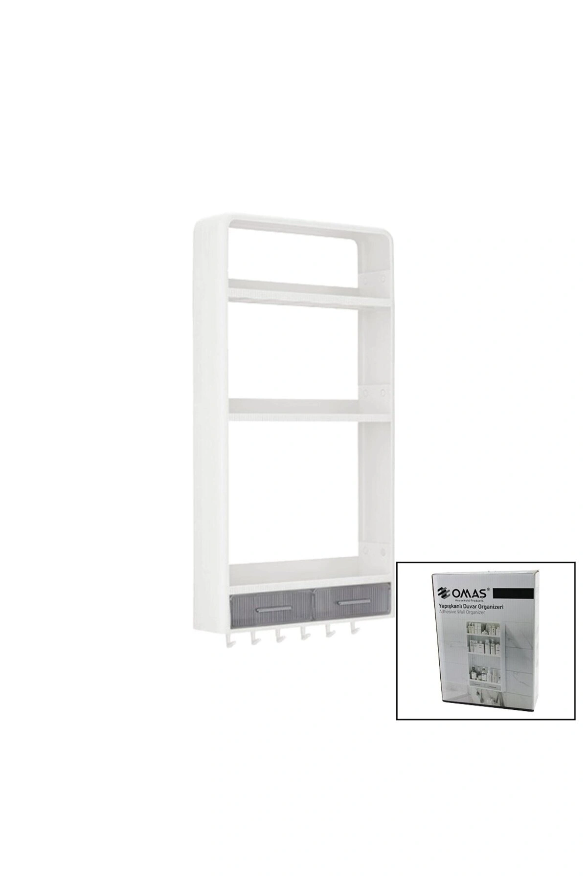 BEYAZ YAPIŞKANLI DUVAR ORGANİZERİ PLASTİK 3 RAF=14CM-19CM-30CM - 2 ÇEKMECE=40CM - 6 ASKI 19 PARÇA