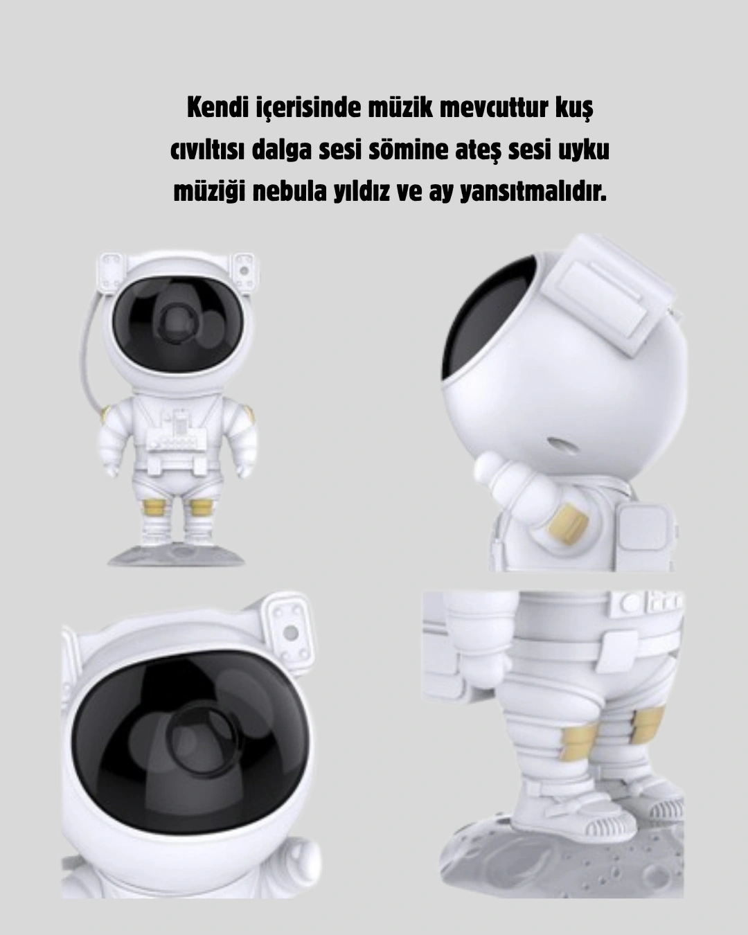 Evde huzurlu bir atmosfer yaratmak isteyenler için ideal! Bluetooth Müzikli Astronot Projeksiyon Lambası Yıldız ve Ay Efektli, müzik, ışık ve ses efektlerini bir araya getirerek benzersiz bir deneyim sunar.Bluetooth bağlantısı sayesinde telefonunuzdan müzik dinleyebilir veya kendi içindeki doğal sesleri (dalga, kuş, şömine, uyku melodisi) dinleyerek rahatlayabilirsiniz.Nebula yıldız projeksiyonu odanızın tavanına galaksi desenleri yansıtır; ay ve yıldız temasıyla büyüleyici bir ambiyans oluşturur.ABS + PC + PVC + TPE malzemeden üretilmiş sağlam yapısı, uzun ömürlü kullanım sağlar.Kompakt ölçüleriyle (120×113×228 mm), masaüstü, komodin veya raflarda kolayca yer bulur.5V/1A USB güç bağlantısı sayesinde bilgisayar, adaptör veya powerbank ile çalıştırılabilir.Uzaktan kumandasıyla ışık renklerini, ses seviyesini ve efektleri tek tuşla değiştirebilirsiniz.Yalnızca 655 gram ağırlığındaki bu lamba, taşınabilir yapısıyla her yerde rahatça kullanılabilir.Hem çocuklar hem yetişkinler için mükemmel bir hediye seçeneği olan bu astronot lambası, evinizi gökyüzüyle buluşturur.