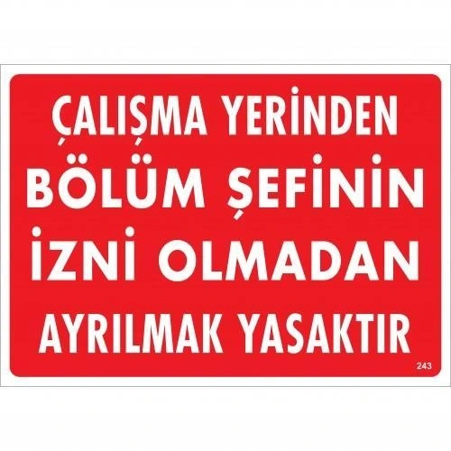 Çalışma Yerinden Bölüm Şefinin İzni Olmadan Ayrılmak Yasaktır Uyarı Levhası 25x35 KOD:239