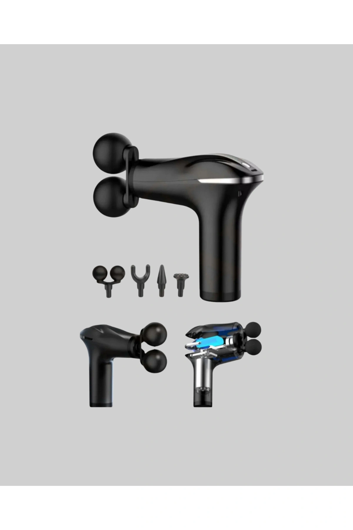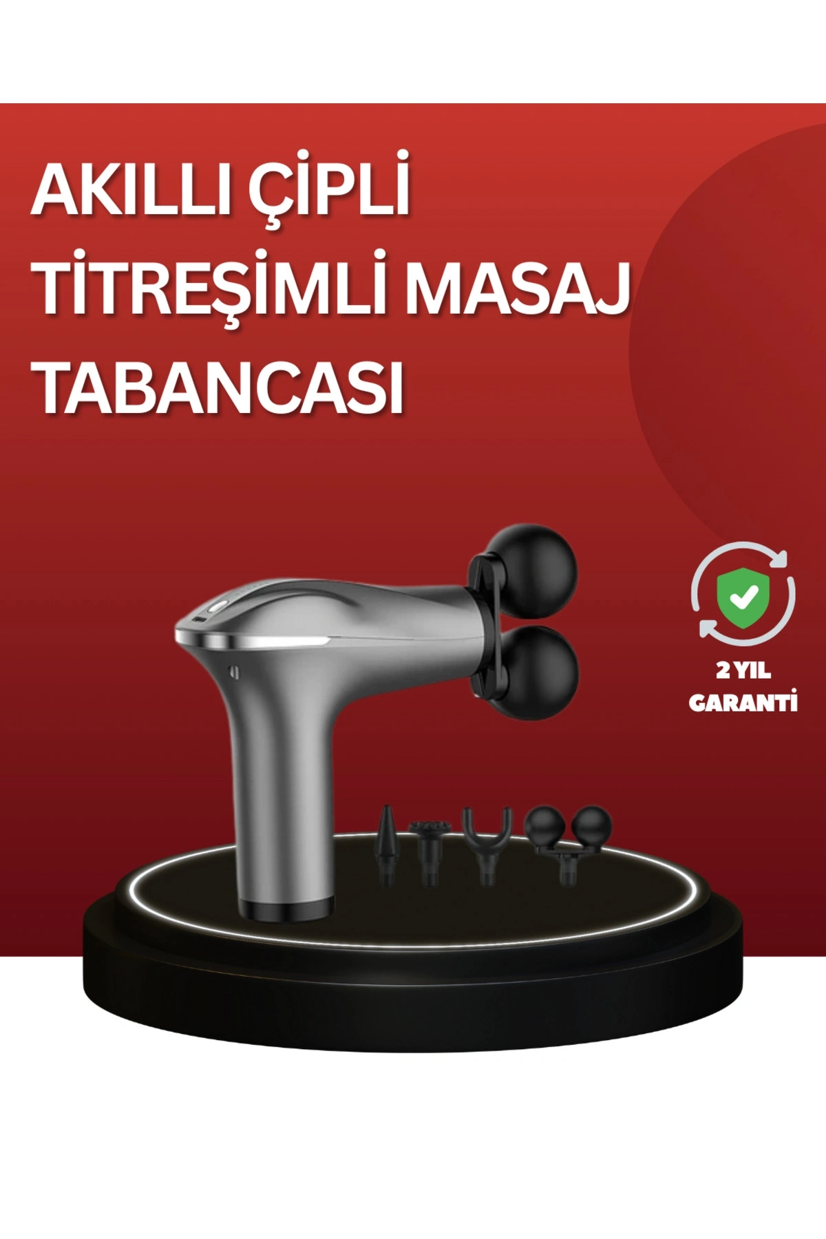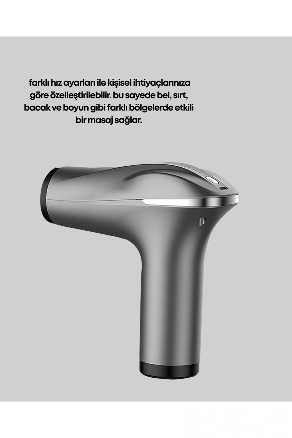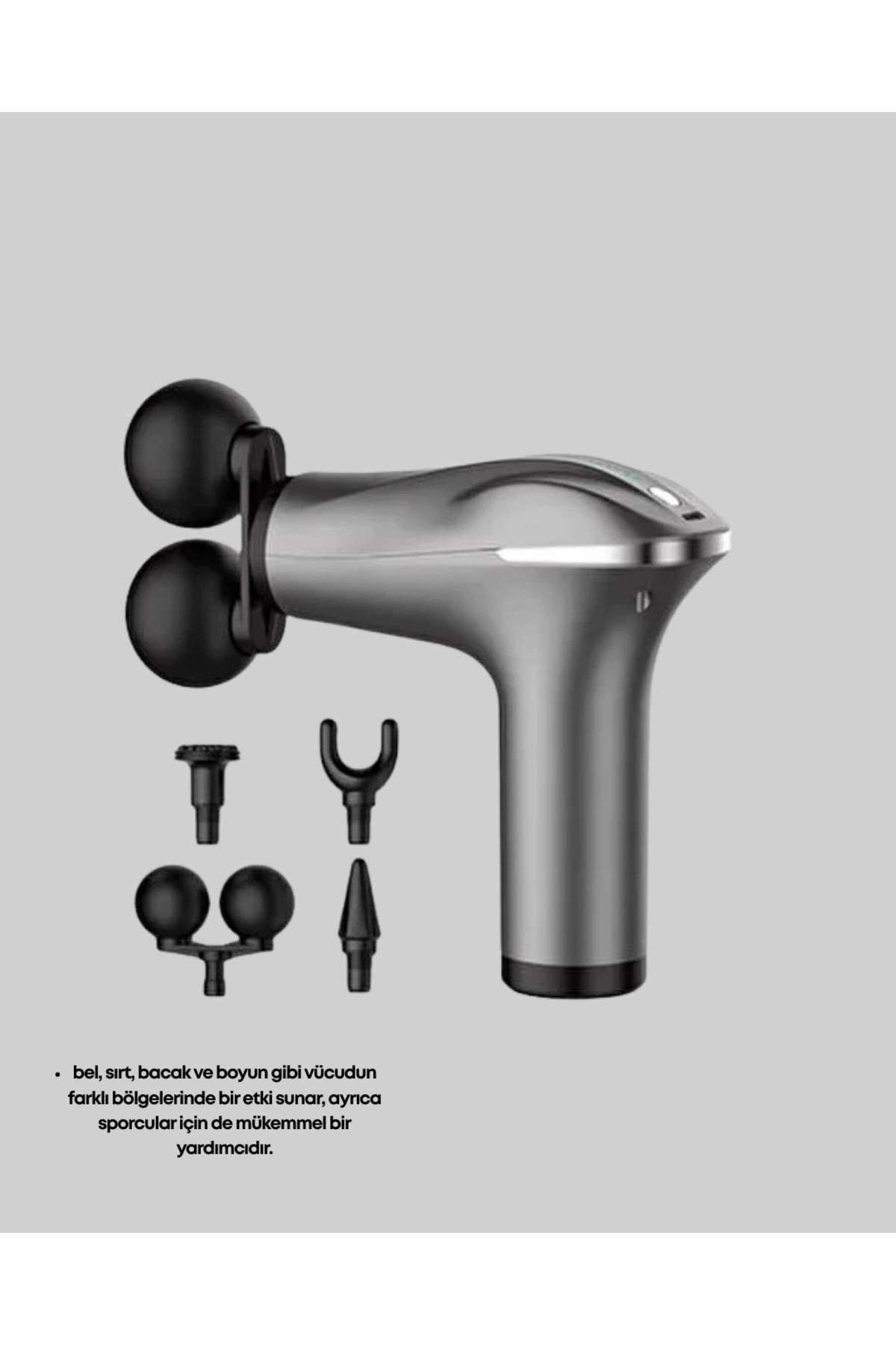Bu titreşimli masaj tabancası, kompakt ve taşınabilir yapısıyla günlük yaşamda hızlı ve etkili bir masaj deneyimi sunmak için tasarlanmıştır.; Özellikle bel, sırt, boyun ve bacak gibi bölgelerde oluşan gerginliği azaltmada oldukça etkilidir.; Güçlü titreşim motoru, kaslara derinlemesine ulaşarak rahatlama sağlar ve spor sonrası toparlanma sürecine katkıda bulunur.; Ürün dört masaj başlığı içerir.; Başlıklar, vücuttaki farklı kas gruplarına özel olarak geliştirilmiştir.; Geniş yüzeyli başlık, büyük kas gruplarında etkili kullanılırken daha küçük başlıklar hassas noktalarda ideal sunar.; Cihazın şarjlı yapısı sayesinde masaj sırasında kablo kısıtlaması yaşamazsınız.; Taşınabilir bir ürün olduğu için evde, sporda veya seyahatte çantanıza atıp her an yanınızda taşıyabilirsiniz.; Ergonomik tasarımı, cihazı elinizde dengeli ve rahat bir şekilde kullanmanızı sağlar.; Masaj tabancasındaki çoklu hız ayarı, farklı ihtiyaçlara göre masaj yoğunluğunu ayarlanabilir hale getirir.; Hafif bir kas rahatlaması ya da daha derin bir masaj uygulamak mümkün olur.; Kas yorgunluğunu azaltmak, stresi hafifletmek ve gün içinde daha enerjik hissetmek isteyen kullanıcılar için ideal bir tercihtir.; Özellikle sporcular için antrenman sonrası kasların toparlanmasına destek sağlayan etkili bir cihazdır.; Şarj edilebilir bataryası uzun kullanım süresi sunar ve kullanıcıya kesintisiz bir masaj deneyimi sağlar.; Sade ve modern tasarım detayları ile hem fonksiyonel hem estetik bir kullanım sunar.; Bu masaj tabancası, günlük yaşamda kolaylıkla kullanılabilecek pratik bir masaj çözümü arayan herkes için mükemmel bir üründür.