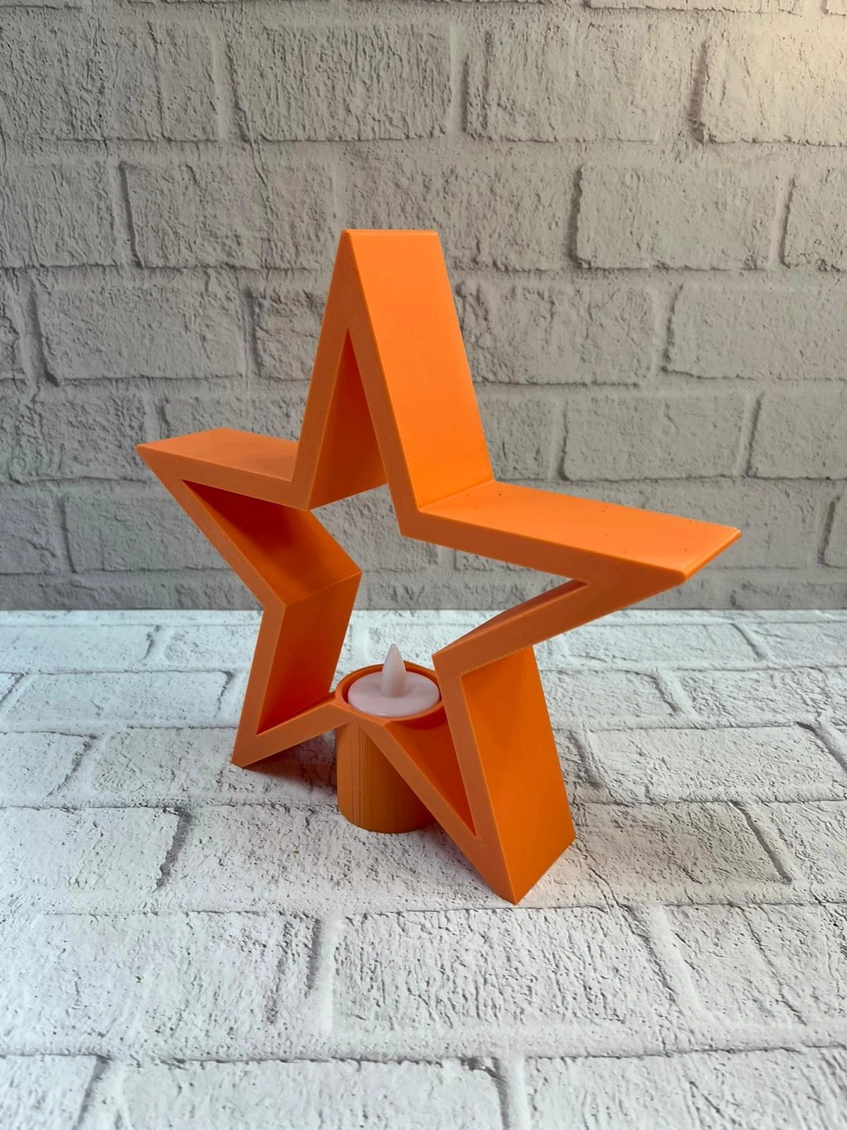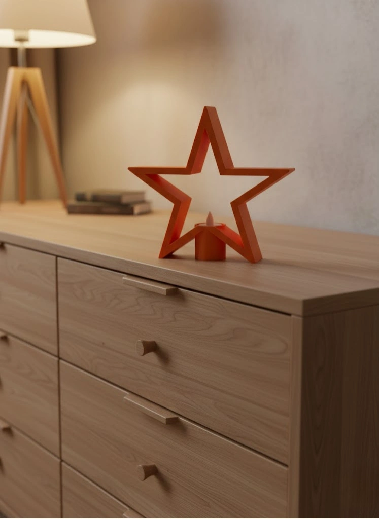 Yıldız formundaki turuncu mumluk, sade tasarımıyla dikkat çekerken rengiyle ortama canlılık katar. Akşam saatlerinde mum ışığıyla birleşerek sıcak ve rahatlatıcı bir ortam oluşturur. Minimal, bohem ve modern dekorasyon stilleriyle uyumlu yapısı sayesinde evin farklı alanlarında rahatlıkla kullanılabilir.