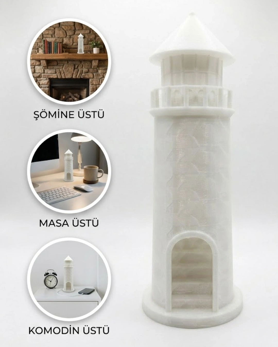Deniz temalı dekorasyon sevenler için tasarlanan 3D deniz feneri dekoratif obje, evinize sahil havası katmak için mükemmel bir alternatiftir. Üç boyutlu yapısı sayesinde gerçekçi bir görünüm sunar ve dekorasyonunuzu tamamlayıcı bir detay oluşturur. Yazlık evlerde, balkon dekorasyonunda veya salon aksesuarı olarak kullanılabilir. Kitaplık raflarında, masa üzerinde veya sehpa üstünde estetik bir görüntü oluşturur. Hafif ve dayanıklı malzemesi sayesinde uzun süreli kullanım sağlar. Minimal beyaz rengi, ferah ve modern bir görünüm sunar. Dekoratif amaçlı ışıklandırma ile birlikte kullanıldığında sıcak bir ambiyans oluşturur.