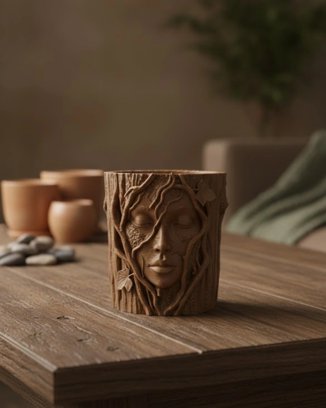 Sanat ile doğanın büyüleyici uyumunu bir araya getiren bu yüz detaylı dekoratif vazo, yaşam alanlarınıza mistik ve etkileyici bir atmosfer kazandırır. Ağaç gövdesi formu içine işlenmiş huzurlu yüz figürü, doğanın ruhunu temsil ederken bulunduğu ortama sanatsal bir derinlik katar. İnce işlenmiş sarmaşık ve yaprak detayları, ürüne üç boyutlu ve heykelsi bir görünüm kazandırır. Toprak tonlarındaki doğal rengi sayesinde hem modern hem rustik dekorasyon stilleriyle kusursuz bir uyum sağlar. Salon raflarında, çalışma masasında, meditasyon köşelerinde ya da balkon dekorasyonunda kullanıldığında bulunduğu alanı sıradanlıktan çıkarır. Işığı yumuşak şekilde yansıtan yüzey dokusu, detayların daha belirgin görünmesini sağlar. İçine yerleştireceğiniz yeşil bitkilerle birlikte doğayla bütünleşen bir kompozisyon oluşturabilir, yaşam alanınıza huzur veren bir enerji katabilirsiniz. Hem dekoratif hem de sanatsal değeri yüksek özel bir tasarımdır.