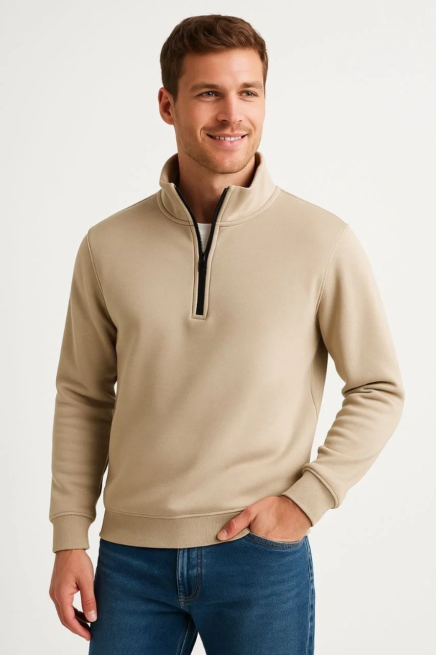 • Erkek Dik Yaka Sweatshirt Dik Yaka Yarım Fermuarlı 3 İplik Şardonlu Pamuk Kumaş - Bej