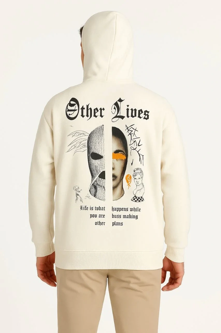 • Erkek Kapşonlu Sweatshirt – Oversize Üç İplik Şardonlu Hoodie, “Other Lives” Ön & Arka Baskılı, Kanguru Cepli, Kışlık Rahat Günlük Stil - Beyaz