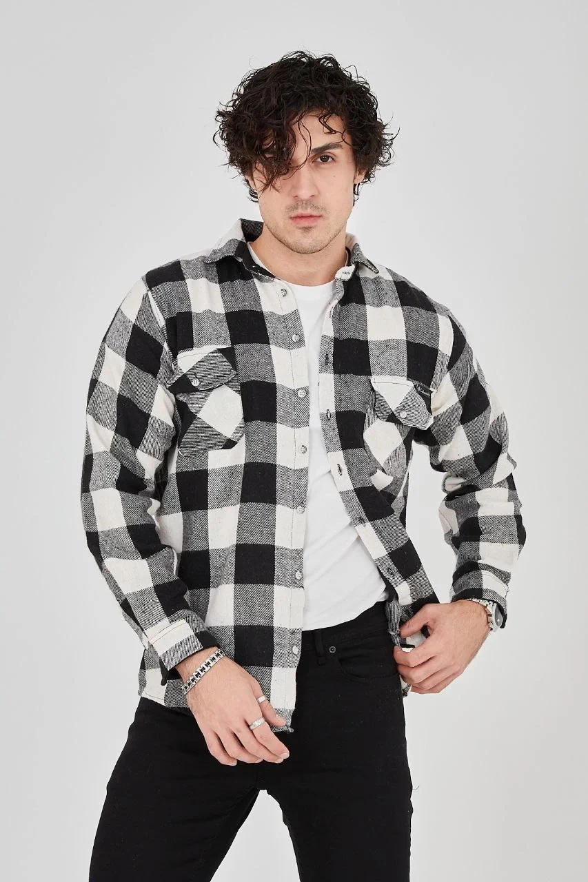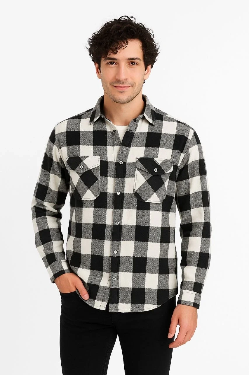 Erkek Oduncu Gömlek – Uzun Kollu, Şardonlu Kumaş, Kareli Desen, Regular Fit, Manşetli, Çift Cepli, Rahat Günlük Bahar & Kış Stil - Siyah