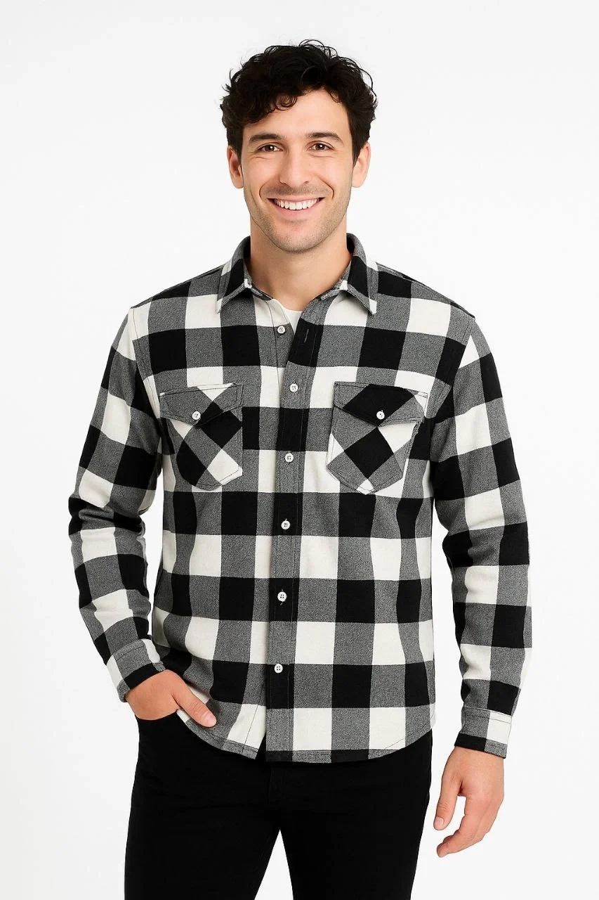 • Erkek Oduncu Gömlek – Uzun Kollu, Şardonlu Kumaş, Kareli Desen, Regular Fit, Manşetli, Çift Cepli, Rahat Günlük Bahar & Kış Stil - Siyah