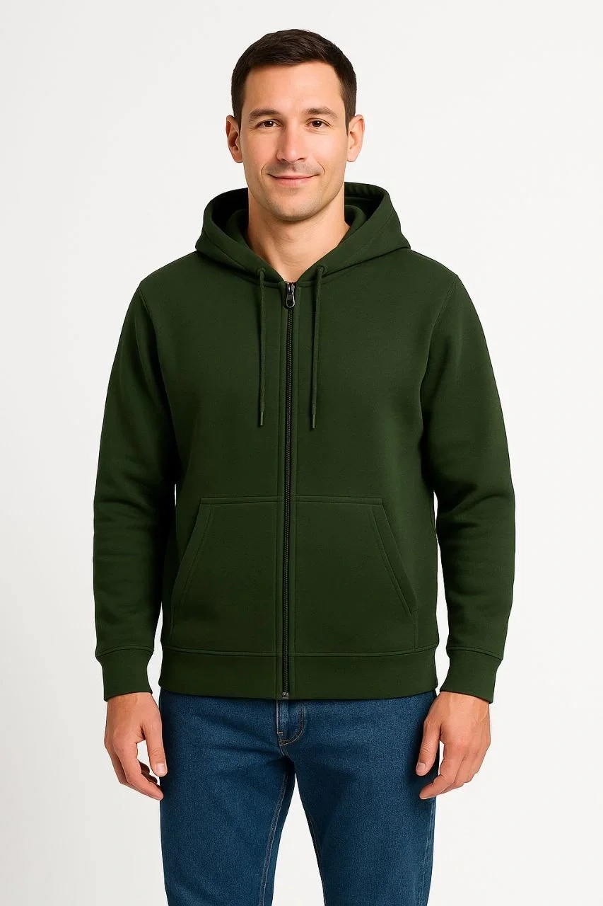 Erkek Üç İplik Kapüşonlu Tam Fermuarlı Kanguru Cepli Sweatshirt Hoodie - Haki