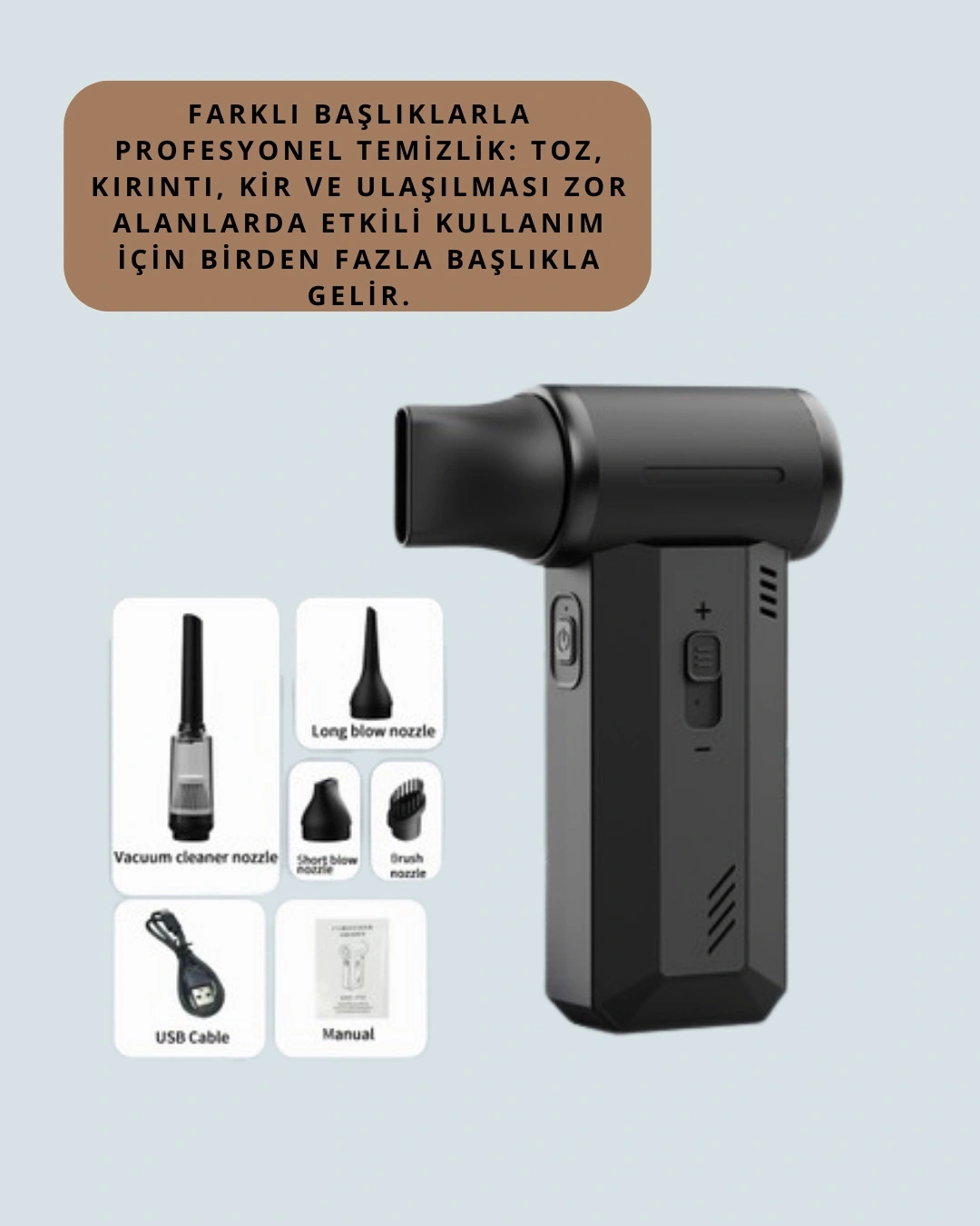 Kompakt boyutları ve güçlü motoru ile bu hava üfleme ve vakum cihazı, farklı alanlarda çok yönlü kullanım sunar. Elektronik cihazlardan araç iç temizliğine kadar birçok yerde kullanılabilir. Şarjlı bataryası sayesinde kablo derdi olmadan pratik kullanım sağlar. Type-C giriş desteği ile hızlı ve kolay şarj edilir. Üç kademe hız seçeneğiyle her ihtiyaca uygun çalışma modu bulunur. Zengin kutu içeriği ile farklı başlık seçenekleri sunar. Dayanıklı gövdesi darbelere ve yüksek ısıya karşı dirençlidir. Hem temizlik hem de serinletme işlevi ile günlük hayatın vazgeçilmez ürünlerinden biridir.