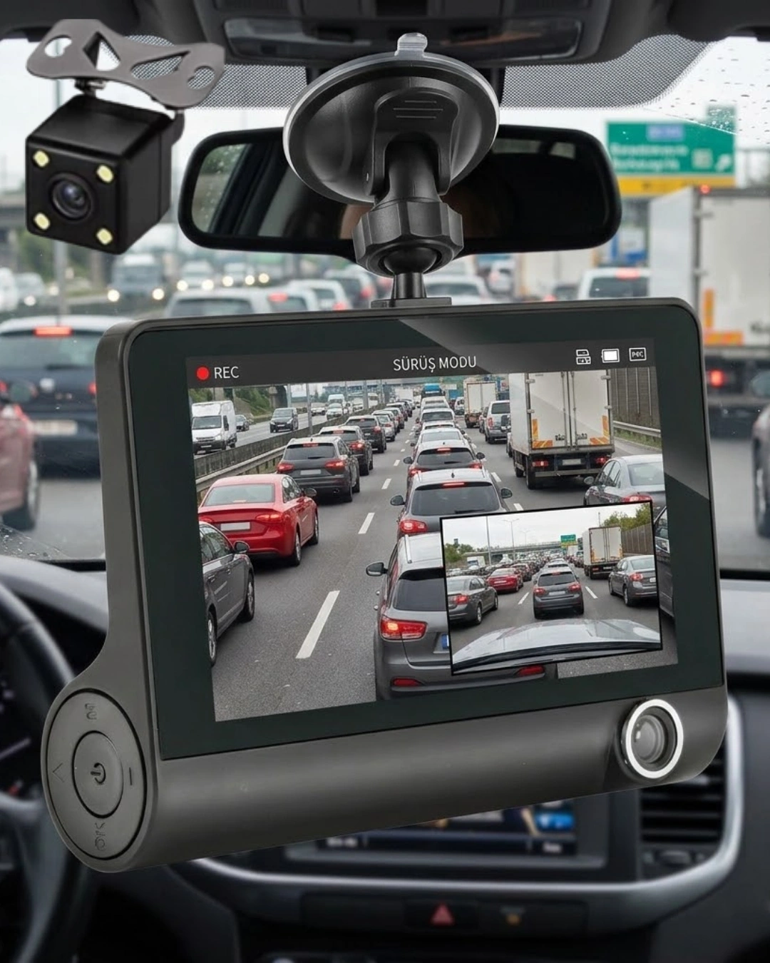 Bu araç içi kamera, gündüz ve gece fark etmeksizin yüksek performanslı kayıt sağlar. Full HD 1080P çözünürlük ile net ve detaylı görüntü elde edilir. Ön ve arka kamera sistemi ile çift yönlü güvenlik sağlanır. 170° geniş açı lens daha geniş yol görüntüsü sunar. WDR teknolojisi ışık dengesi sağlar. Gece görüş özelliği karanlık ortamlarda net kayıt sunar. Döngüsel kayıt ve 32 GB microSD desteği sayesinde kesintisiz kullanım sağlar. G-sensör çarpışma anında kaydı kilitler. Park modu ve hareket algılama ile 7/24 araç güvenliği sağlanır. 4 inç LCD ekran anlık görüntü kontrolü sunar. Araç kamerası, oto güvenlik kamerası ve çift lens araç DVR kategorisinde güçlü bir üründür.