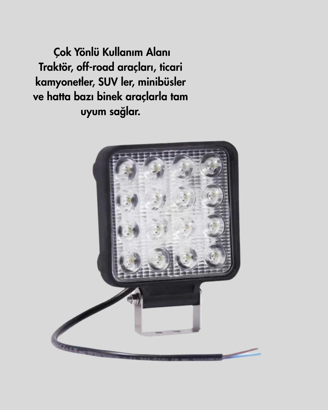 Gece çalışmaları, uzun yol sürüşleri ve arazi koşullarında ihtiyaç duyduğunuz güçlü ışık performansını bu 16 LED’li araç farı ile elde edin. İş makineleri, traktörler ve arazi araçları için özel olarak geliştirilmiş bu far, geniş açılı ışık yayılımı sayesinde sürüş sırasında çevre görüşünü artırır.Yüksek parlaklığa sahip LED modülleri sayesinde düşük enerjiyle maksimum performans sunar. Ayrıca sağlam gövde yapısı, kötü hava koşullarına ve dış etkilere karşı uzun ömürlü koruma sağlar. Hem güvenlik hem de işlevsellik açısından üstün bir seçenektir. Kolay montaj imkanı sayesinde kullanıcı dostudur.