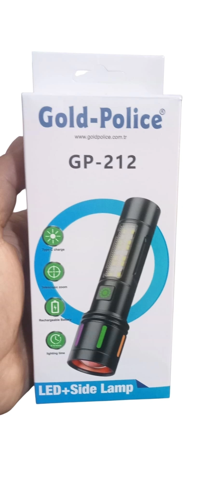 Gold Police GP-212 Şarjlı Metal El Feneri, 1000 lümen ışık gücüyle uzun menzil ve geniş açı aydınlatma sağlar. 5 farklı mod ile (güçlü, kısık, flaşör, beyaz COB, mavi-kırmızı çakar) her ihtiyaca uygundur. ZOOM özelliği sayesinde uzak mesafeleri net şekilde aydınlatır. Type-C şarjlı, su geçirmez ve dayanıklı metal gövdeli tasarımıyla profesyonel kullanım için idealdir.