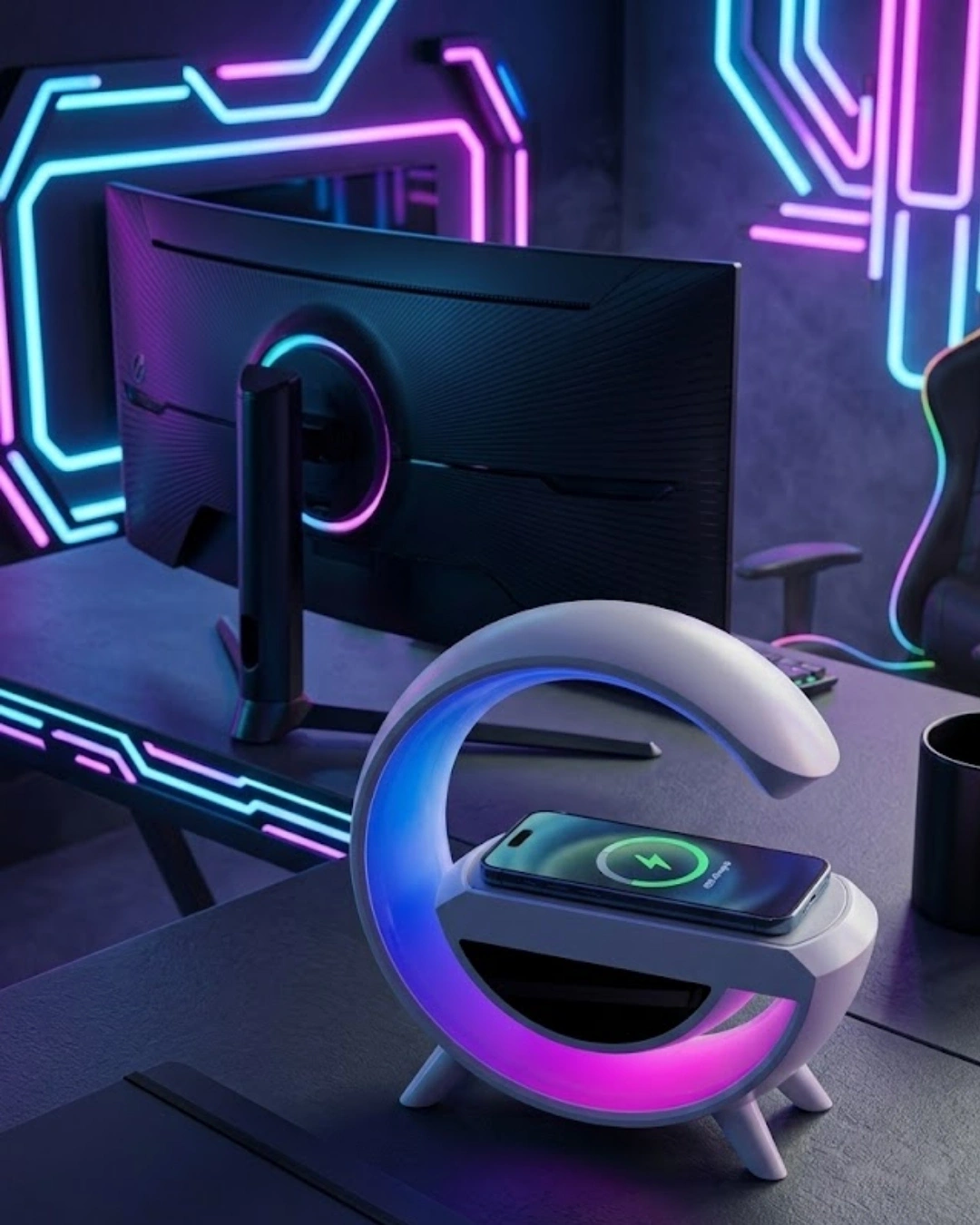Çok fonksiyonlu bu cihaz, kablosuz şarj, Bluetooth hoparlör, RGB ışık ve saat özelliklerini bir araya getirir. Modern tasarımı sayesinde hem dekoratif hem de kullanışlıdır.Kablosuz şarj özelliği ile telefonunuzu kolayca şarj edebilirsiniz. Bluetooth hoparlör ile müzik keyfi yaşayabilirsiniz.RGB ışık ile ortamınıza farklı bir hava katabilirsiniz. Dijital saat ve alarm özelliği ile günlük kullanımınızı kolaylaştırır.Hem ev hem ofis için ideal bir üründür.