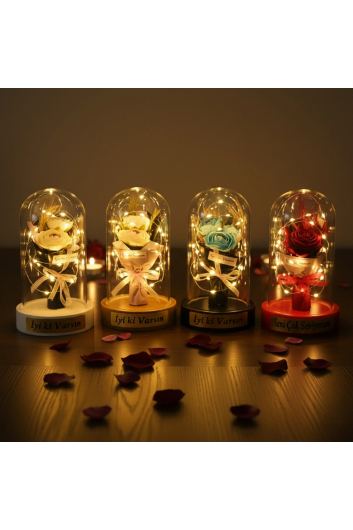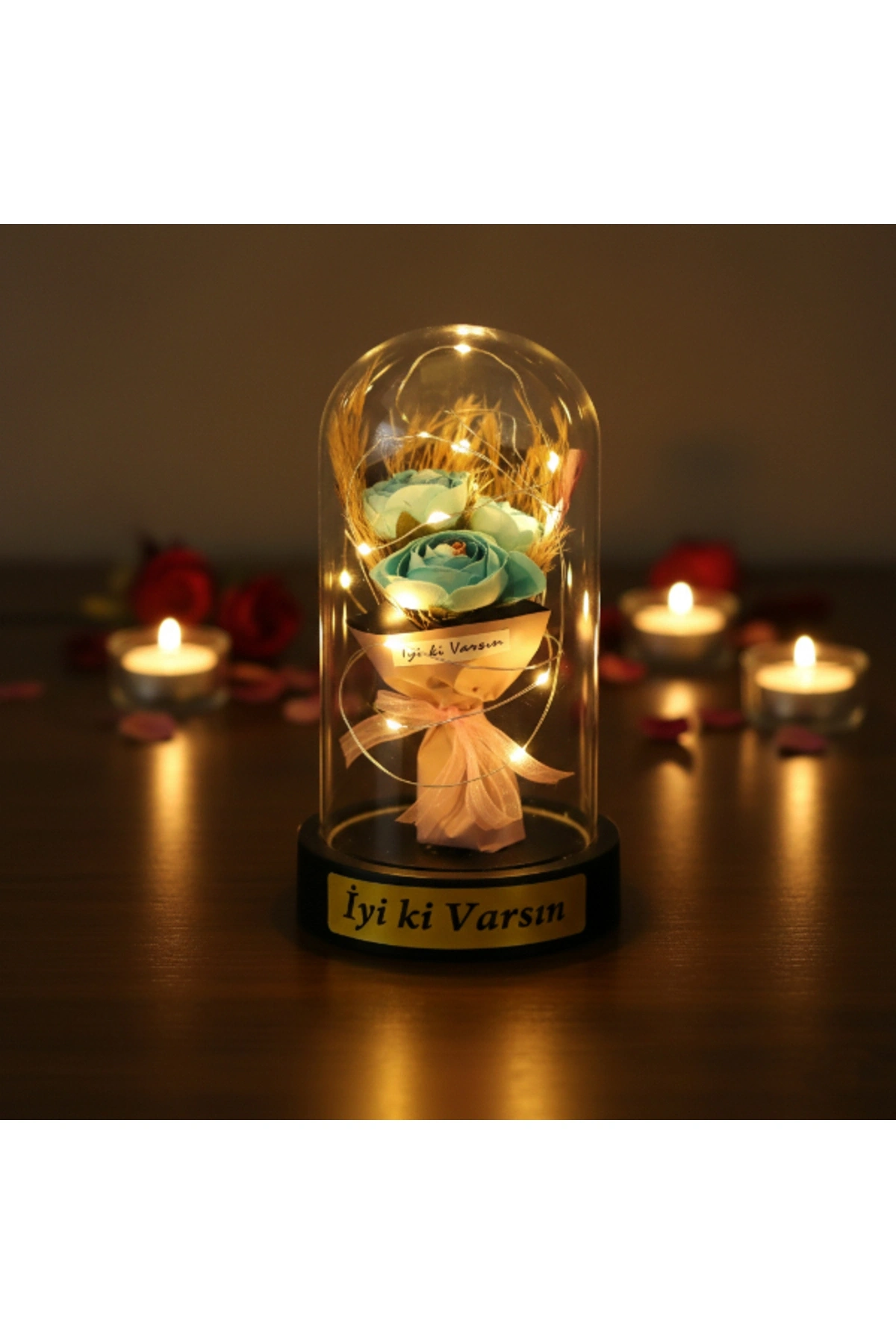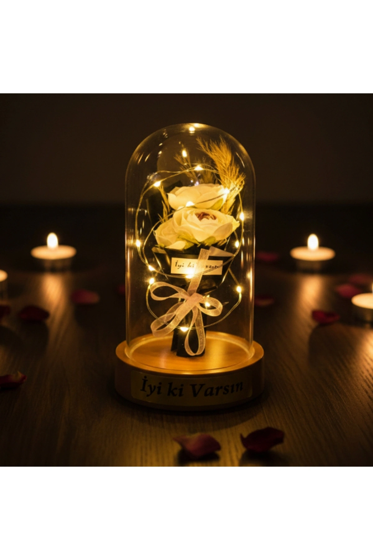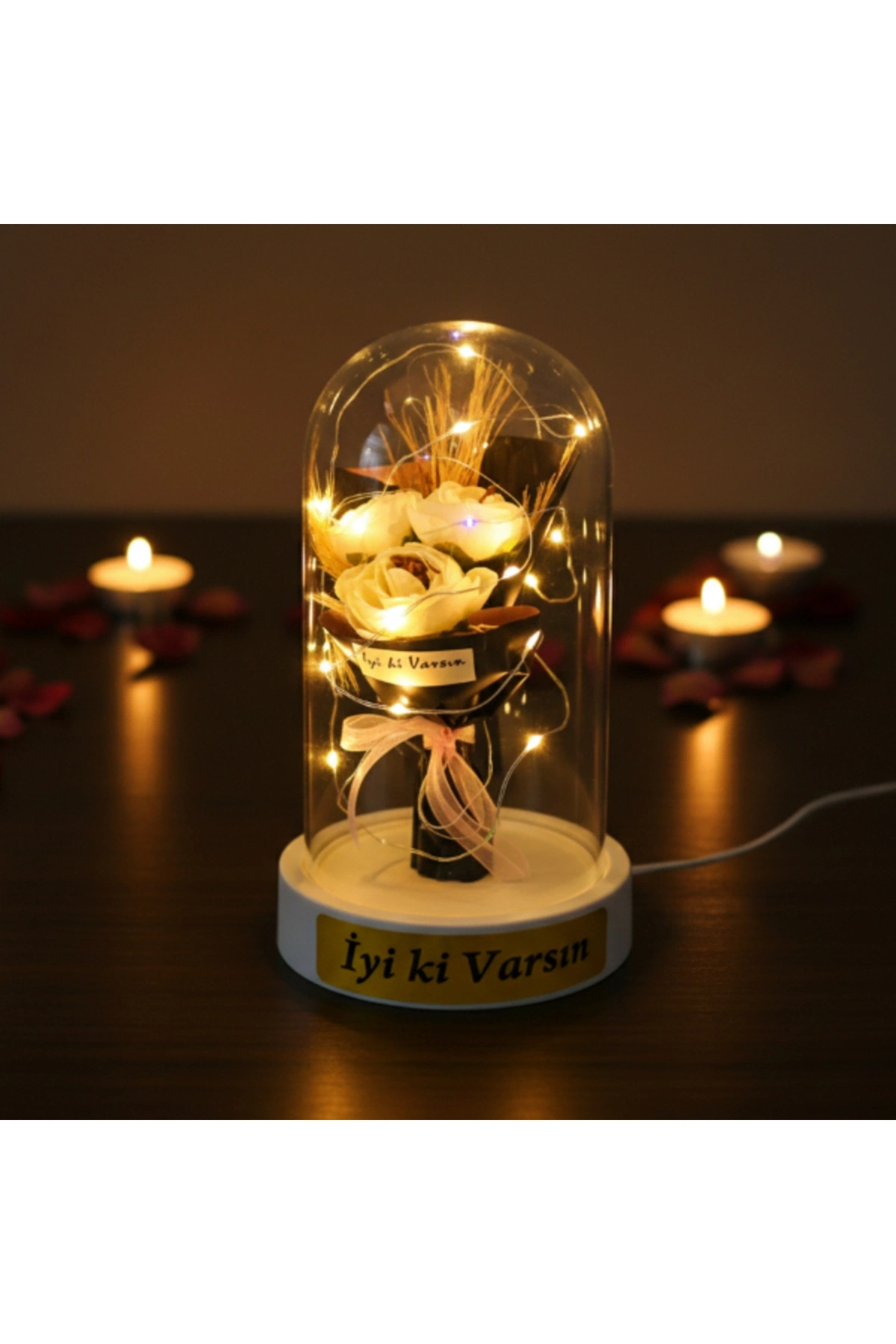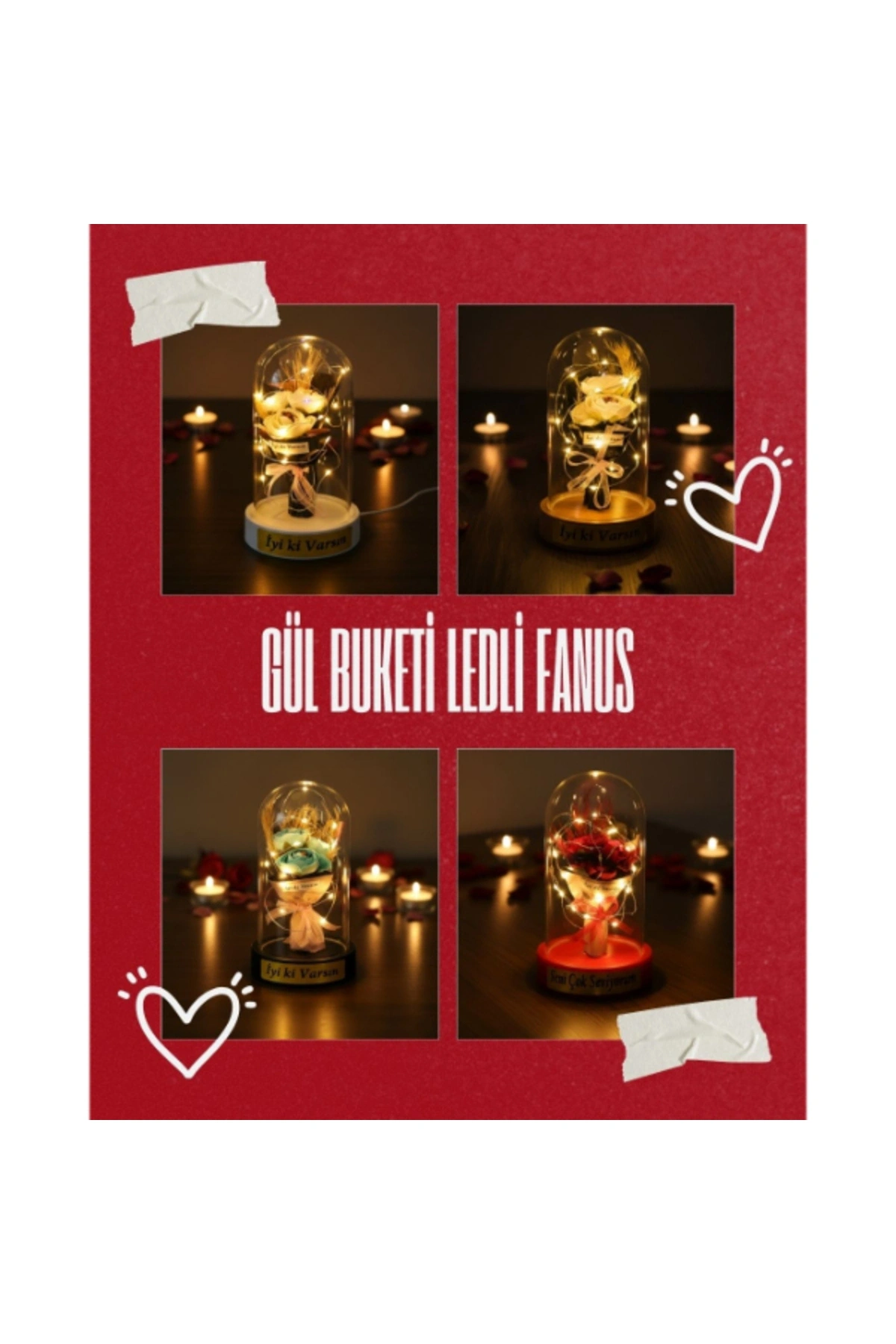 GÜL BUKETİ LEDLİ FANUSÜrün ÖzellikleriGül buketi ledli fanus, zarif tasarımı ve romantik duruşuyla yaşam alanlarına sıcak ve estetik bir ambiyans kazandıran dekoratif bir üründür. Şeffaf fanus içerisinde yer alan üç güllü buket tasarımı, bütüncül ve şık bir görünüm sunarak ürünü klasik fanus modellerinden ayırır. Sahip olduğu gün ışığı LED aydınlatma, yumuşak ve göz yormayan ışık yapısıyla masa, komodin ve raf üzerinde huzurlu bir atmosfer oluşturur. LED ışıkların fanus içerisinde dengeli şekilde yayılması, ürünü hem gündüz dekoru hem de akşam saatlerinde etkileyici bir gece aksesuarı haline getirir. Kompakt ölçüsü sayesinde yer kaplamadan kullanılabilen bu model, sevgililer günü, doğum günü ve yıl dönümü gibi özel anlarda romantik hediyelik fanus arayanlar için ideal bir tercihtir. Model seçimi yapılamayan ürün, görsellerde yer alan tasarımlardan biri olacak şekilde karışık model gönderimi yapılmaktadır.Ürün Teknik Özellikleri Özellik Açıklama Ürün Adı Gül Buketi Ledli Fanus Boyut 10 x 18 cm Aydınlatma Gün ışığı LED Tasarım Şeffaf fanus, üç güllü buket Model Karışık gönderilir Kullanım Alanı Masa, komodin, raf Kullanım Amacı Dekoratif ve hediyelik Paket İçeriği1 adet üç güllü gül buketi ledli fanus