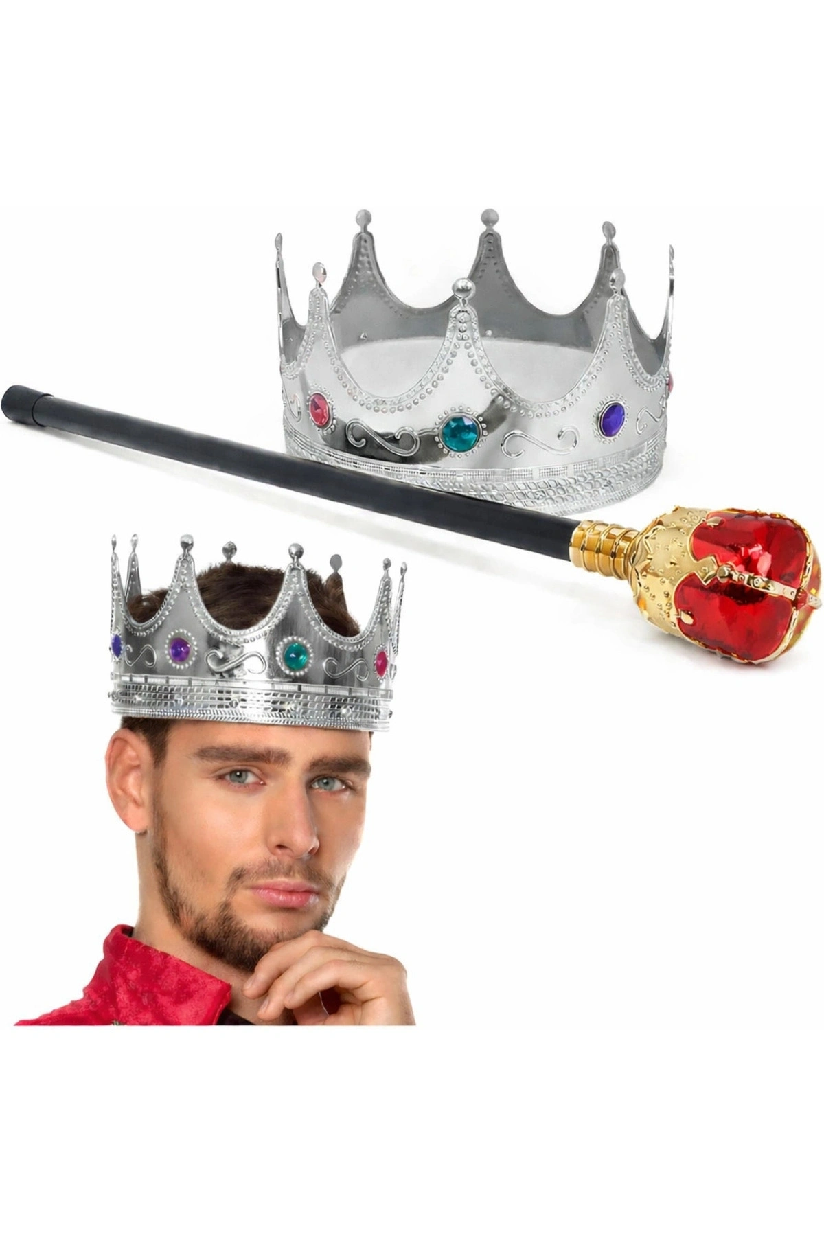 Gümüş renk taşlı kral tacı ve kırmızı gold topuzlu kral asası ile kraliyet şıklığını tamamlayın.; Partiler, kostüm etkinlikleri, doğum günleri, sahne gösterileri ve eğlenceli organizasyonlar için özel olarak tasarlanmıştır.; Ürün Özellikleri 1 gümüş renk kral tacı 60 cm 1 kırmızı gold topuzlu kral asası Taşlı ve detaylı kraliyet tasarımı Parti, kostüm ve sahne kullanımı için ideal Hafif ve rahat kullanım Yetişkin ve genç kullanımına uygundur Kullanım Alanları Kral & kraliçe kostümleri Doğum günü ve temalı partiler Sahne, tiyatro ve gösteriler Eğlenceli fotoğraf çekimleri Not: Ürün aksesuar amaçlıdır
