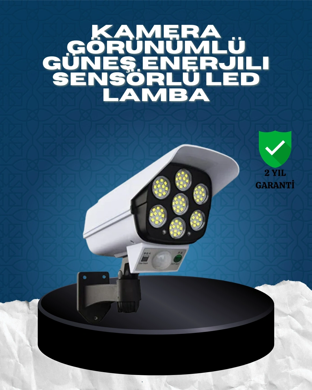 Güvenlik ve aydınlatmayı tek üründe birleştiren güneş enerjili kamera görünümlü LED duvar lambası, dış mekanlar için pratik ve etkili bir çözümdür. Gerçek güvenlik kamerasını andıran tasarımı sayesinde yalnızca aydınlatma sağlamaz, aynı zamanda caydırıcı bir güvenlik etkisi oluşturur. Ev, bahçe, garaj, site girişi, balkon ve dış cephe kullanımı için idealdir. Ürünün üst kısmında yer alan polikristal güneş paneli, gün boyunca güneş ışığını depolar ve gece boyunca lambanın çalışmasını sağlar. Elektrik bağlantısına veya kabloya ihtiyaç duymadan çalıştığı için hem enerji tasarrufu sağlar hem de montaj kolaylığı sunar. Kurulum için profesyonel destek gerekmez. 6 adet yüksek parlaklık sunan SMD LED sayesinde geniş alanlarda etkili bir aydınlatma elde edilir. Hareket sensörü 120° geniş algılama açısına sahiptir ve 5–8 metre mesafedeki hareketleri algılayarak otomatik olarak devreye girer. Sensörlü yapısı sayesinde yalnızca ihtiyaç duyulduğunda çalışır ve gereksiz enerji tüketimini önler. Ürün, uzaktan kumanda ile kontrol edilebilen 3 farklı çalışma moduna sahiptir. İsteğe bağlı olarak sadece hareket algılandığında yanma, düşük ışık + hareketle parlak ışık veya sabit orta seviye aydınlatma seçenekleri kullanılabilir. Su geçirmez yapısı sayesinde yağmur, kar ve zorlu hava koşullarına karşı dayanıklıdır. 360° ayarlanabilir başlığı ile ışık yönü istenilen alana kolayca çevrilebilir.