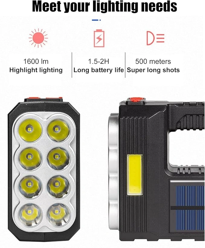 GÜNEŞ ENERJİLİ KAMP AV FENERİ“Doğadan Gelen Işıkla Maceralarınızı Aydınlatın!”Güneş Enerjili Kamp Av Feneri, doğa aktivitelerinizde ve açık hava maceralarınızda ihtiyacınız olan çok yönlü bir aydınlatma çözümü sunar. Çok seviyeli anahtarlama özelliği ile farklı aydınlatma modları arasında kolayca geçiş yapabilir ve çeşitli kullanım ortamlarına uygun ışık seviyelerini zahmetsizce ayarlayabilirsiniz.Kompakt ve hafif tasarımı sayesinde kolay taşınabilir olan bu fener, su geçirmez yapısıyla rüzgar ve yağmurdan etkilenmez, böylece macera, gece koşusu, kamp, bakım ve yürüyüş gibi etkinliklerde güvenle kullanılabilir. Enerji tasarrufu sağlayan ve çevre dostu LED fener, yalnızca güneş enerjisiyle şarj edilebilir. Uzun pil ömrü sunan dahili 18650 lityum pil ile uzun süreli kullanım imkanı tanır.Yüksek kaliteli 3030 lamba boncukları ve COB yan ışıkları ile donatılmış olan Güneş Enerjili Kamp Av Feneri, güçlü parlaklık, yüksek ışık kalitesi ve saf renk sunumu ile öne çıkar. USB ve solar şarj seçenekleri, farklı senaryoların aydınlatma ihtiyaçlarını karşılayarak kullanıcılara esneklik sağlar. Dayanıklı ABS su geçirmez gövdesi ile her koşulda yanınızda olmaya hazırdır.
