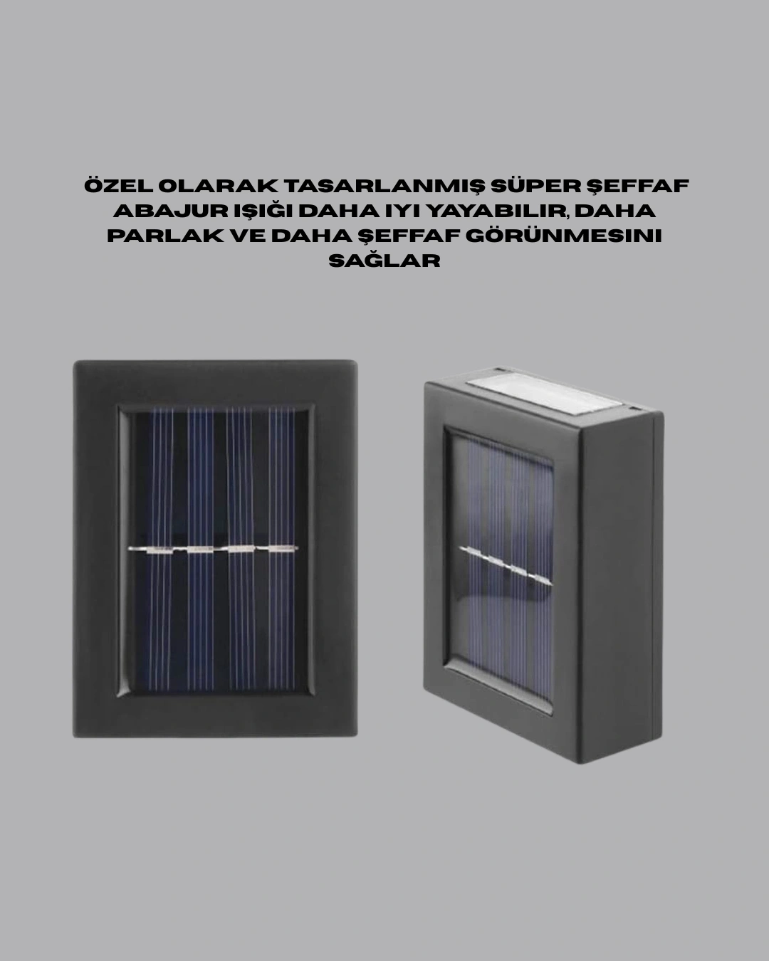 Bu LED duvar lambası, dış mekanlar için tasarlanmış, elektrik bağlantısına ihtiyaç duymadan çalışan güneş enerjili bir aydınlatma çözümüdür. Üzerindeki polikristalin silikon güneş paneli, gün boyunca enerjiyi verimli şekilde emer ve gece kullanım için 8 saatlik aydınlatma sağlar.IP65 sertifikalı su geçirmezlik, ürünü açık hava koşullarına dayanıklı hale getirir. Cihaz yağmura, neme ve dış ortam etkilerine karşı koruma sağlar.Yüksek verimli 2 LED SMD lamba, enerji tasarrufu sağlayarak uzun ömürlü bir kullanım sunar. Abajur kısmında kullanılan özel PC malzeme, ışığın daha geniş ve net yayılmasını mümkün kılar.Ürün, sıcak ışık, beyaz ışık ve çok renkli ışık olmak üzere üç farklı ışık moduna sahiptir. Bu sayede ortamın ambiyansına uygun seçim yapılabilir. Bahçelerde, balkonlarda, duvar üstlerinde ya da yürüyüş yollarında rahatlıkla kullanılabilir.