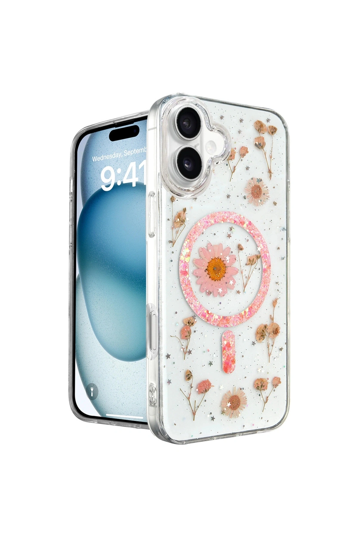 İphone 16 Kılıf Daisy Simli Magsafe Kapak - Pembe